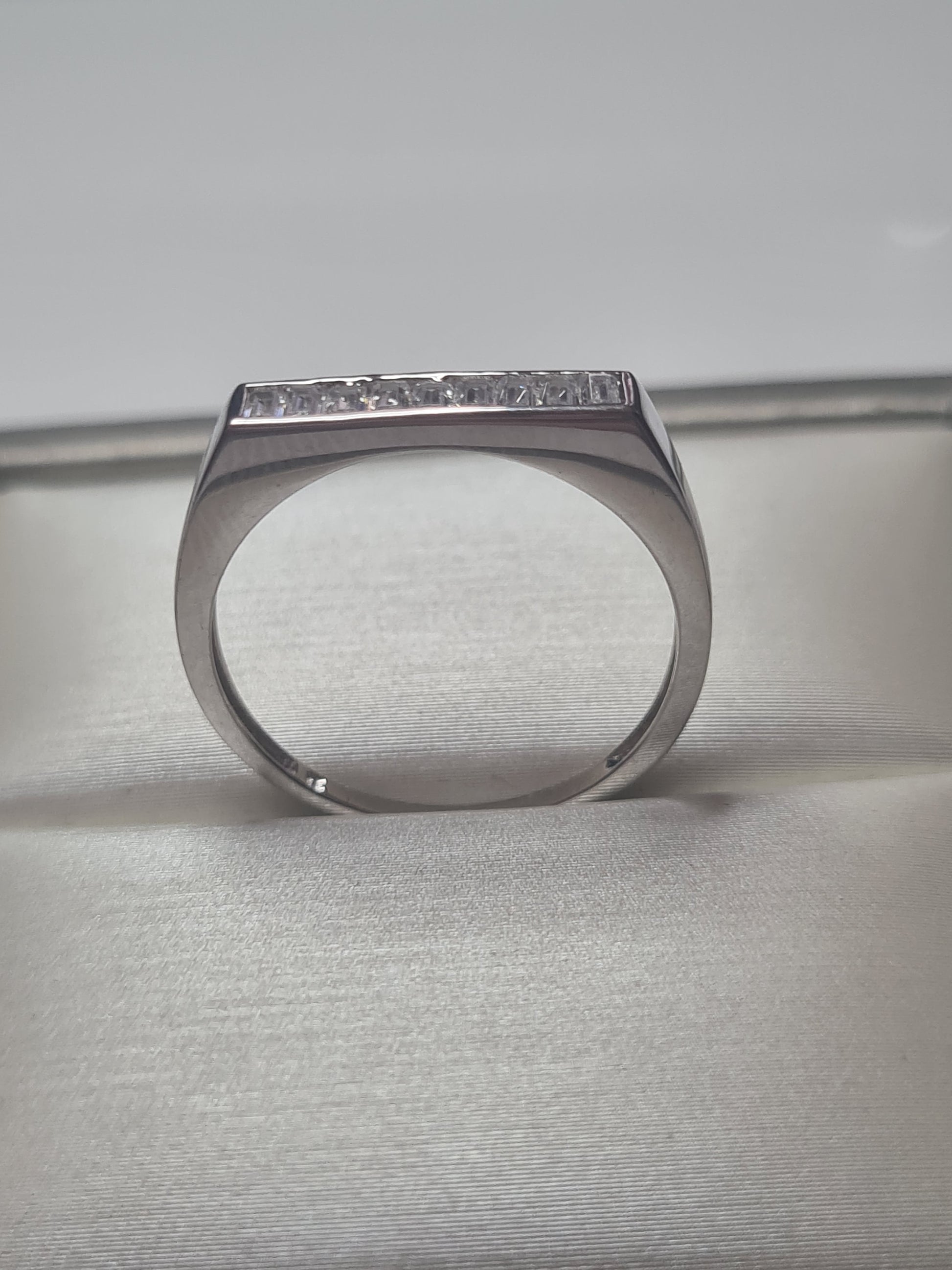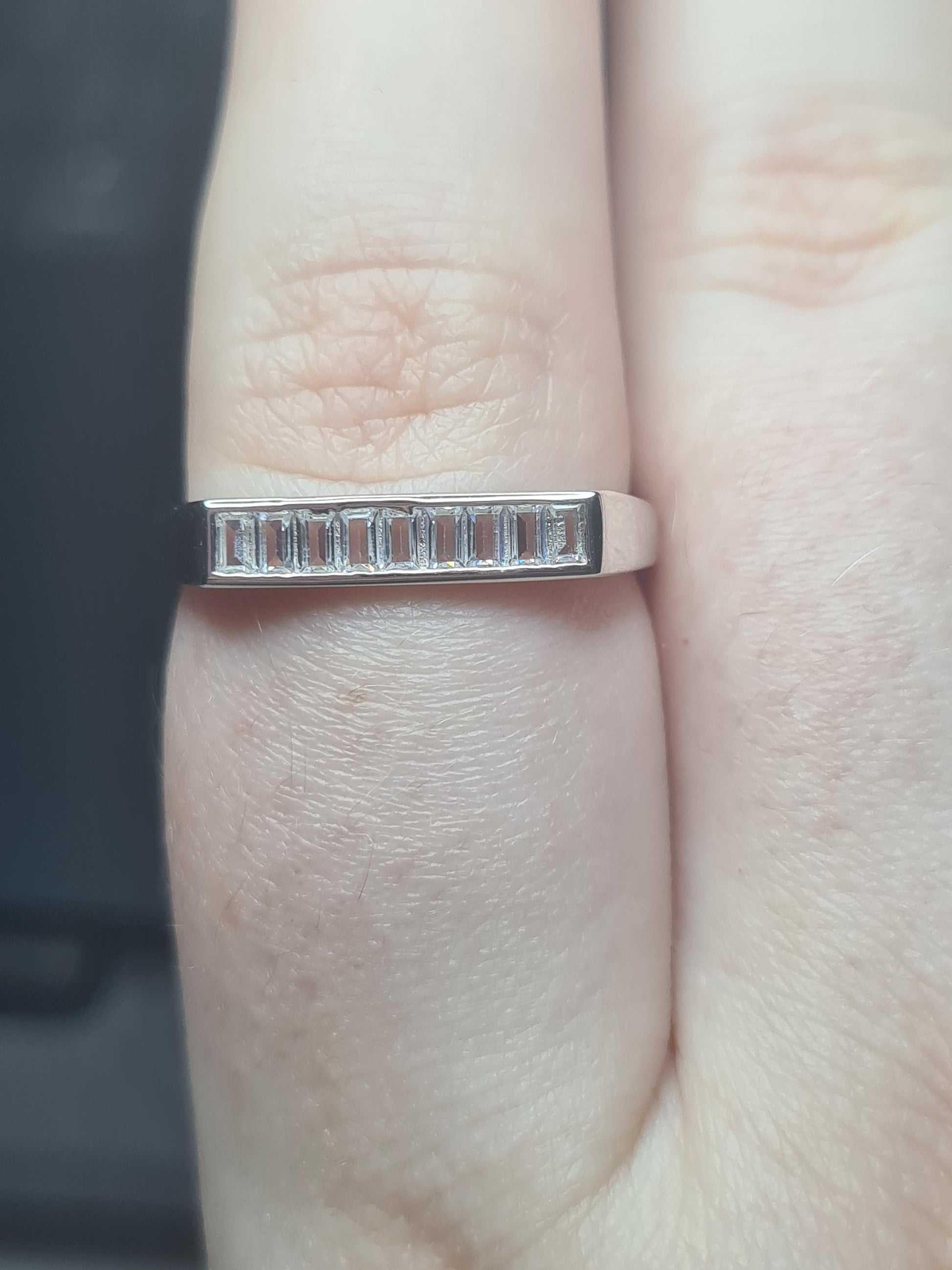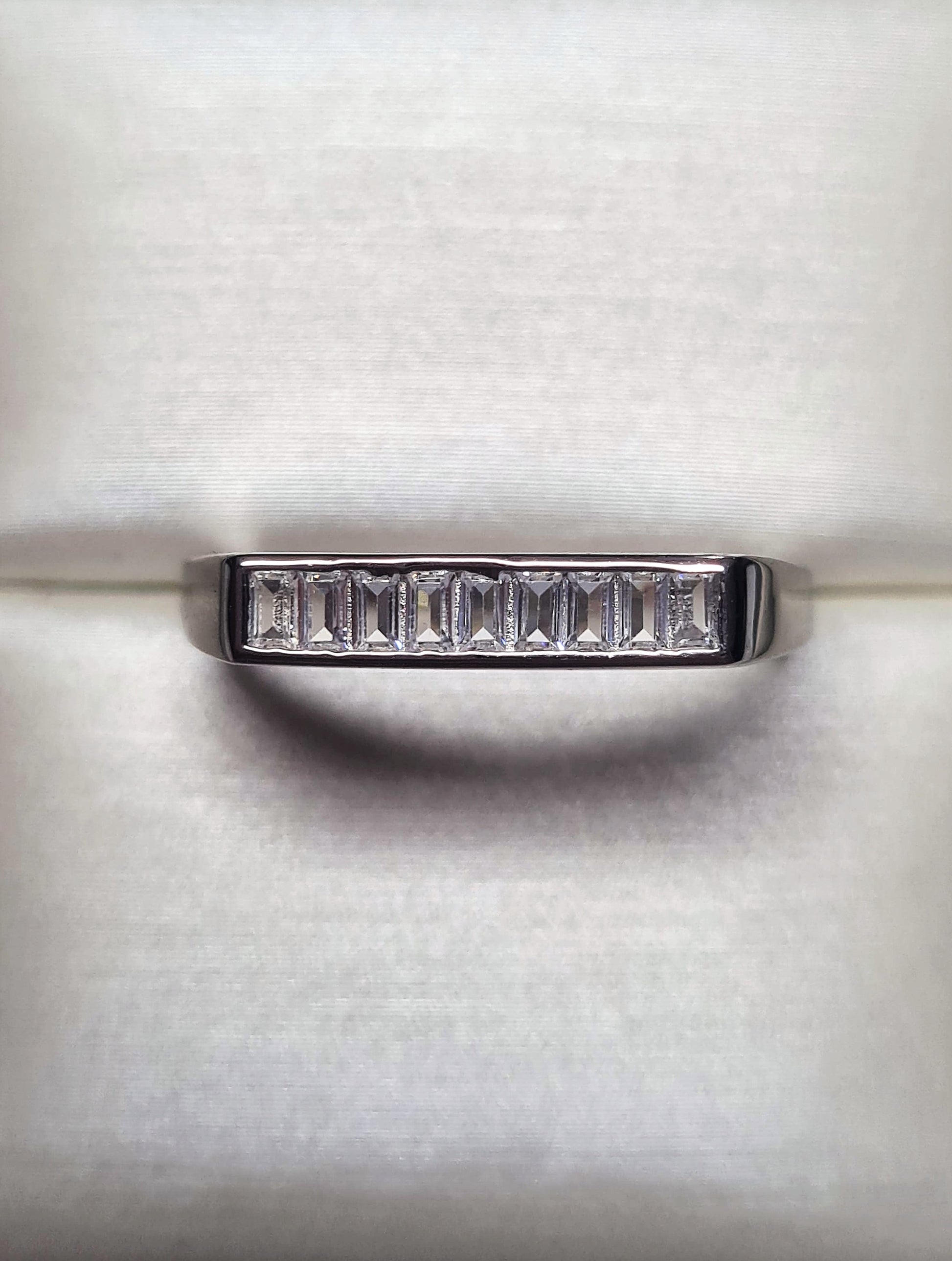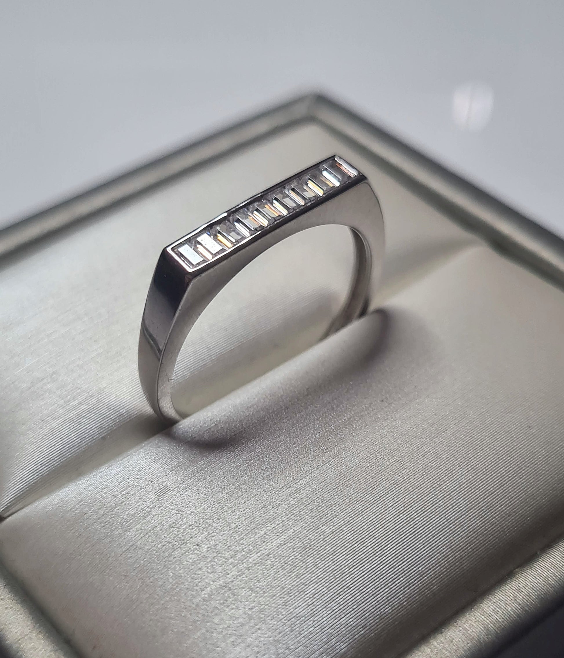 Timeless Elegance: The simulated baguette cut diamonds create a timeless and sophisticated look, capturing the allure of classic diamond jewelry. The channel setting enhances the continuity and brilliance of the stones.