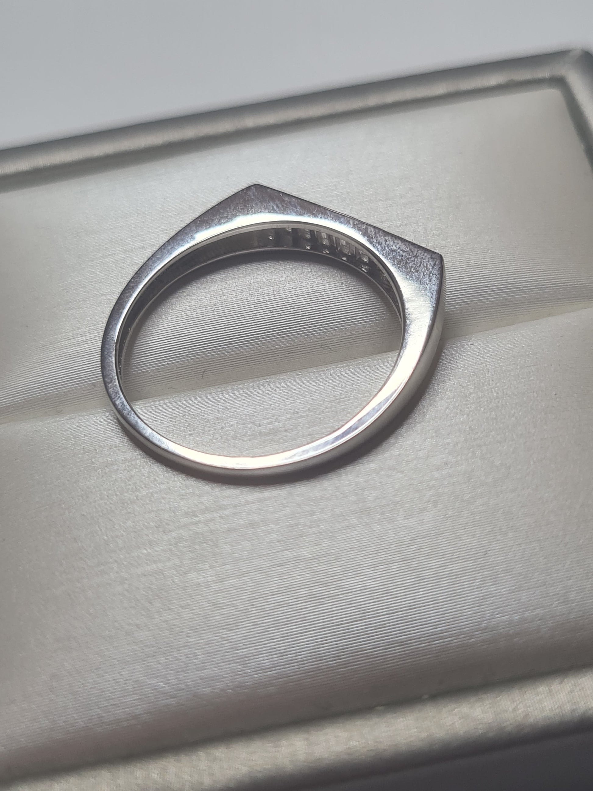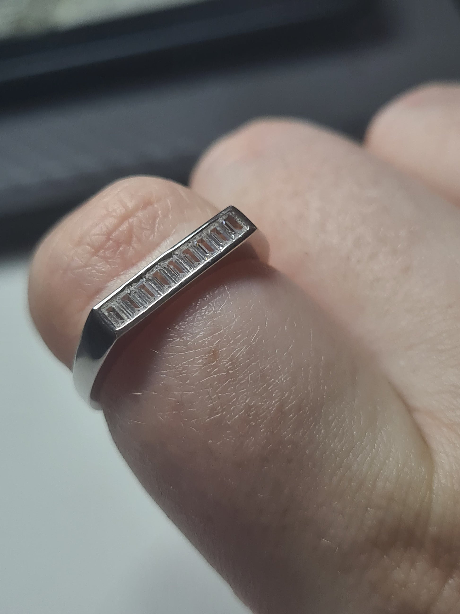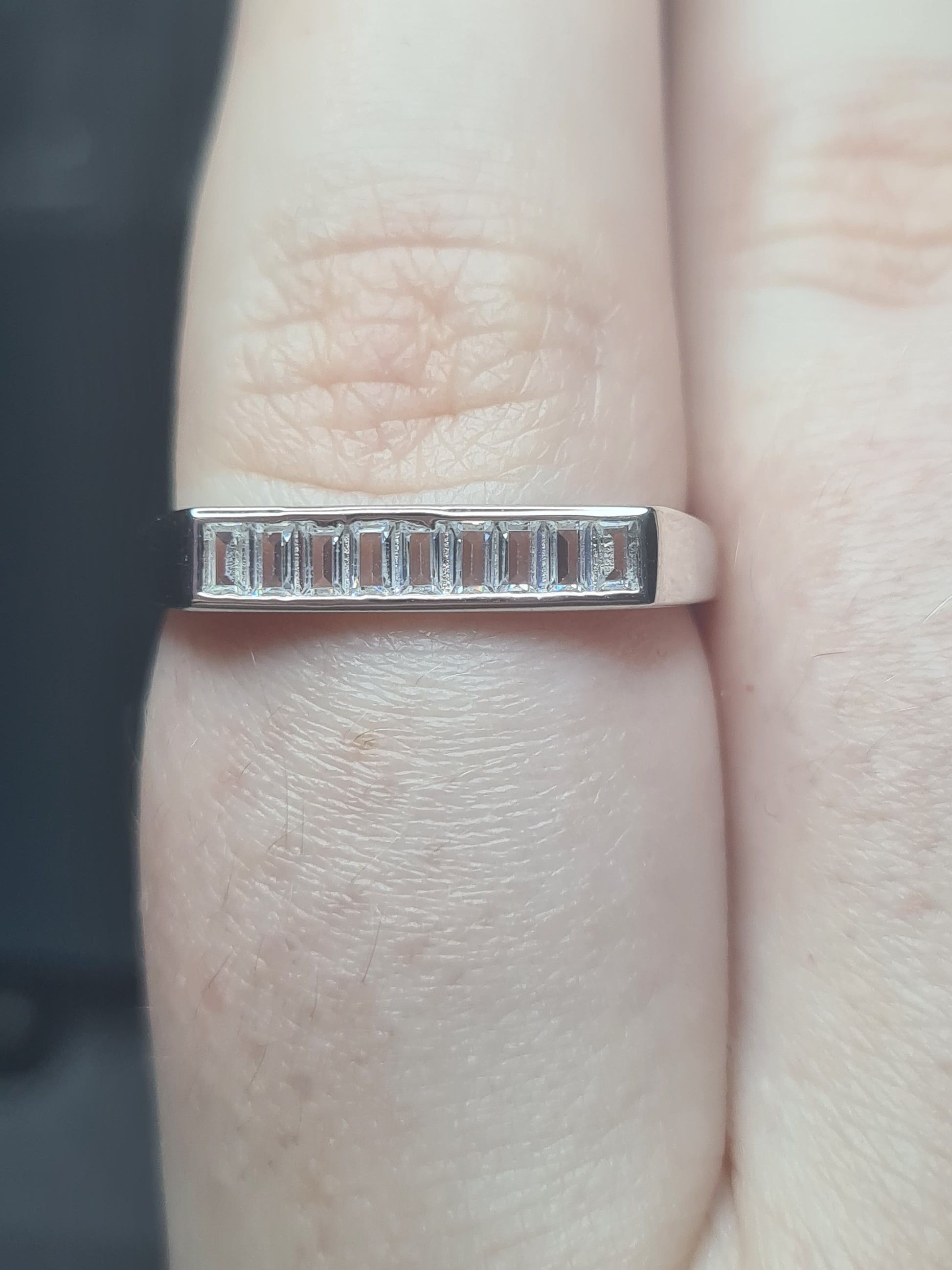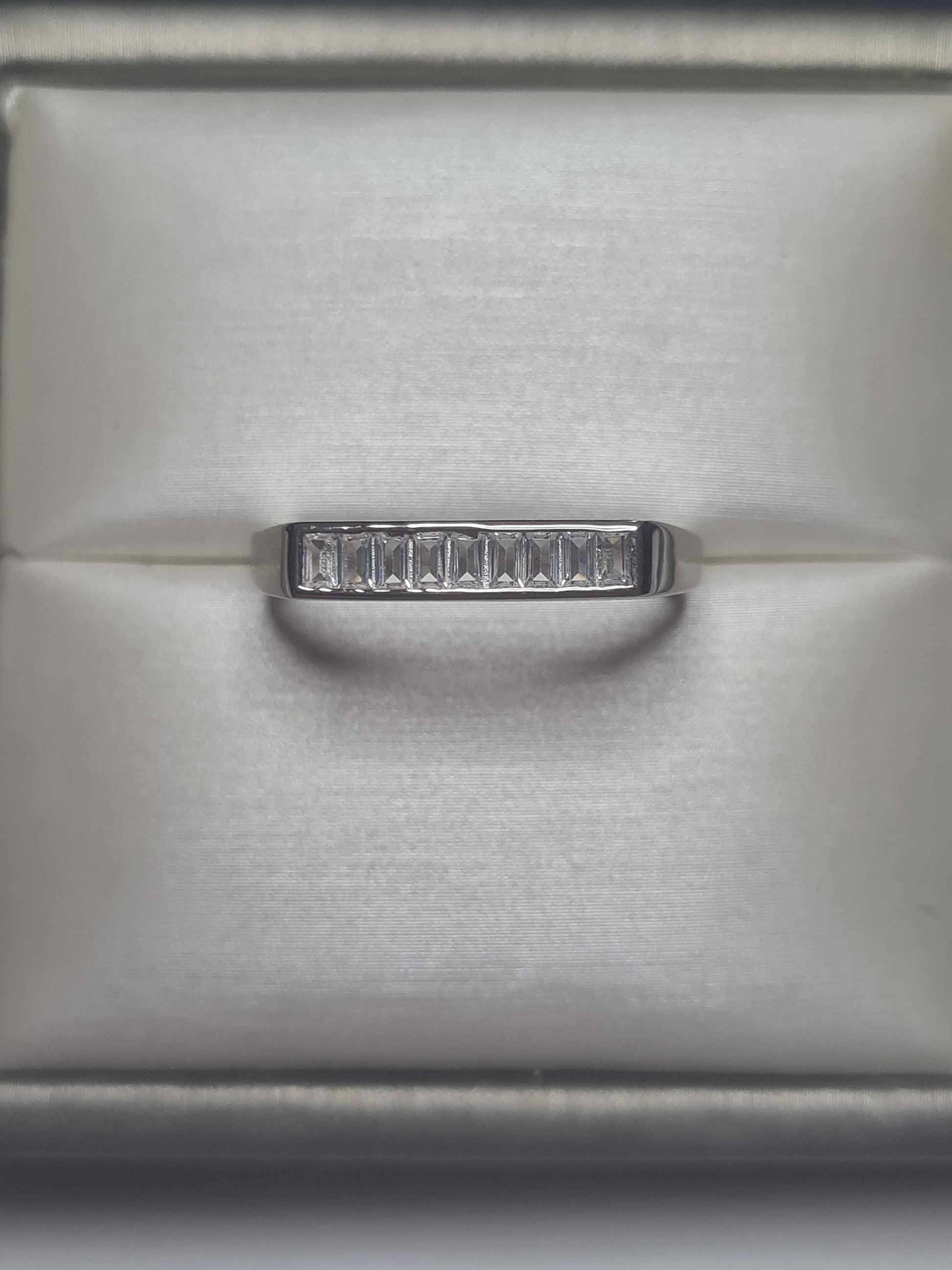 Indulge in timeless elegance with our Simulated Baguette Cut Diamond Ring—a stunning piece meticulously crafted in hallmarked 925 solid sterling silver. This exquisite ring, designed for everyday wear, features a row of 9 simulated diamond baguettes, each measuring 2.5x1.5mm with a combined faceted weight of 0.320 carats.