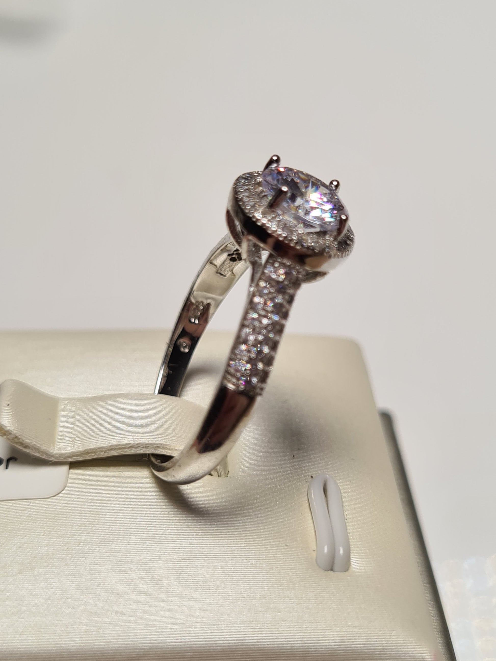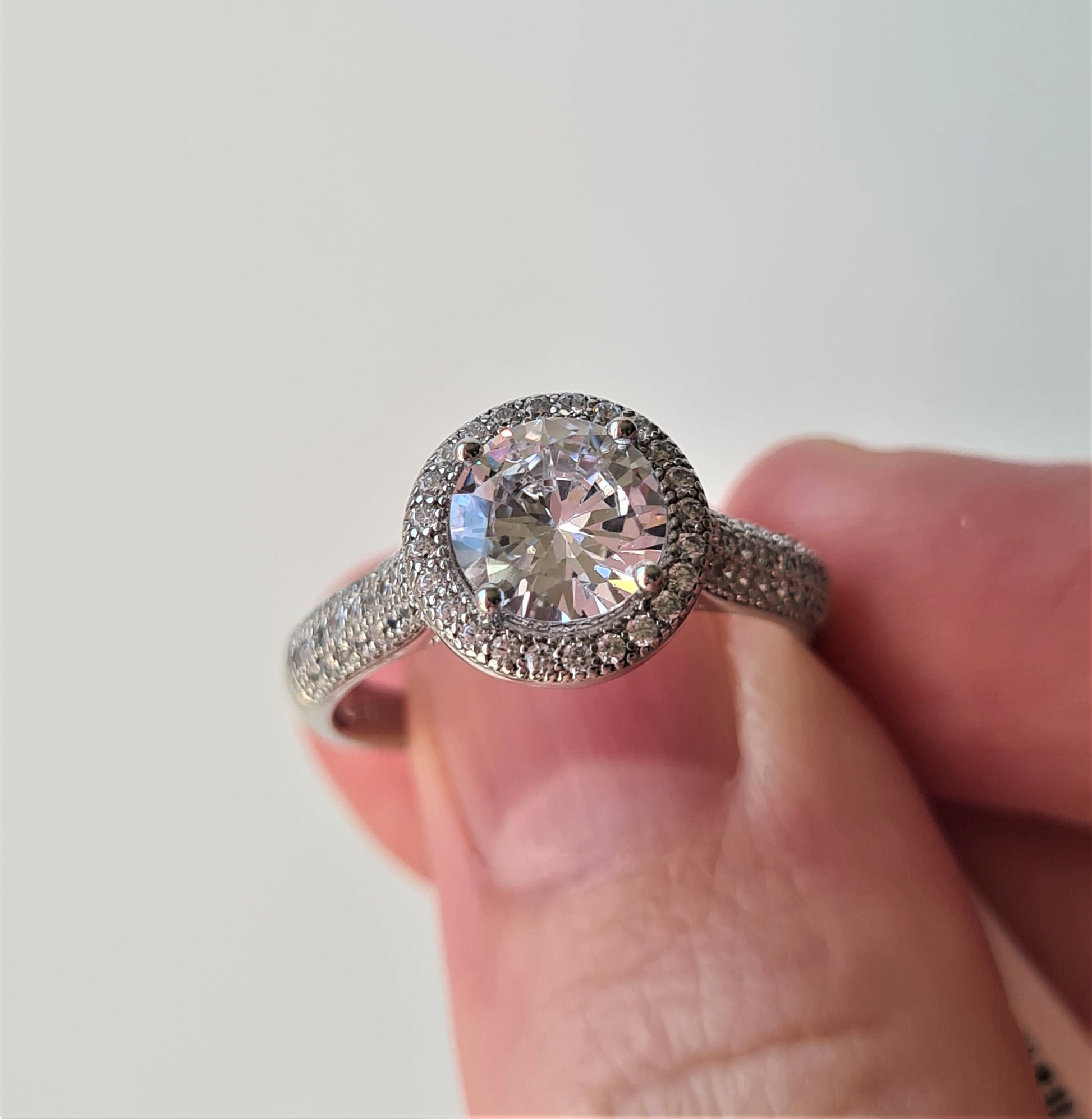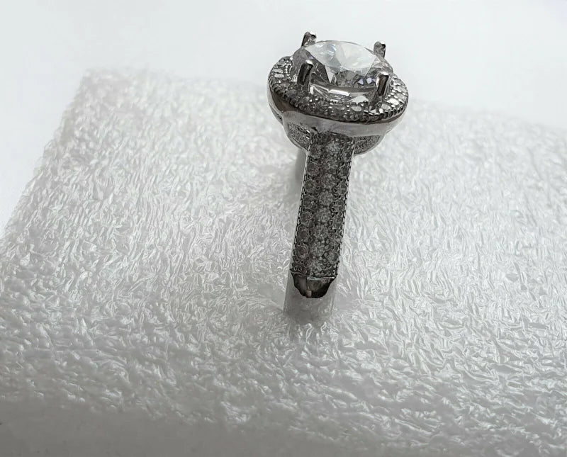 - Brilliant Halo Design: The ring boasts a mesmerizing halo design featuring simulated diamonds that replicate the brilliance of real flawless diamonds. The exquisite detail extends to smaller stones gracefully descending down the shoulders, enhancing the overall radiance.