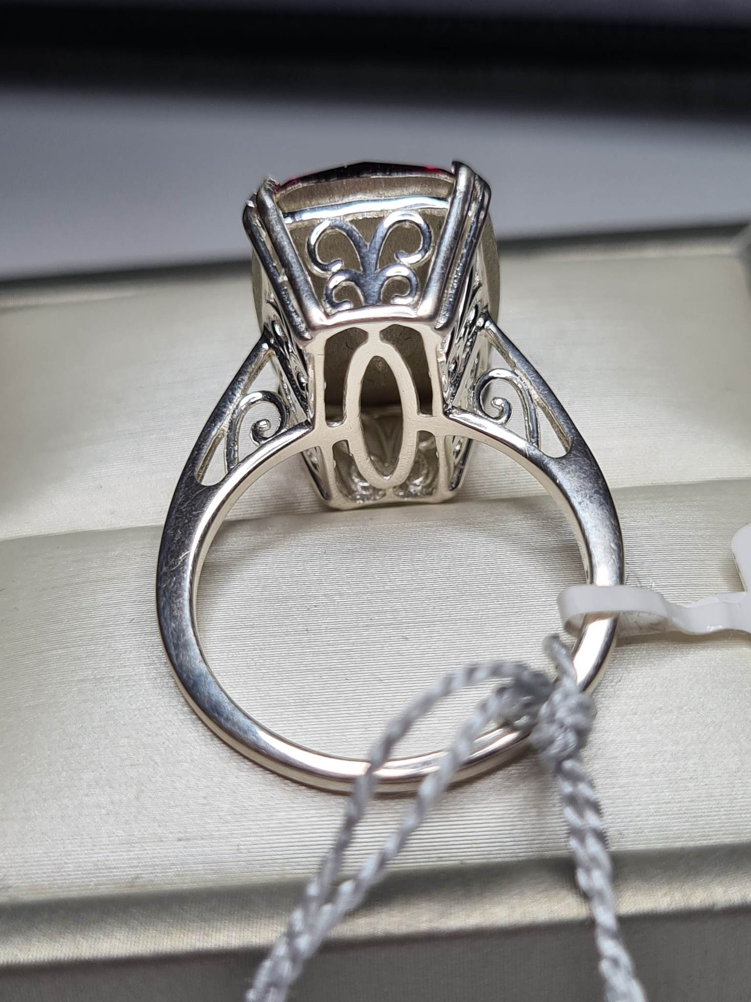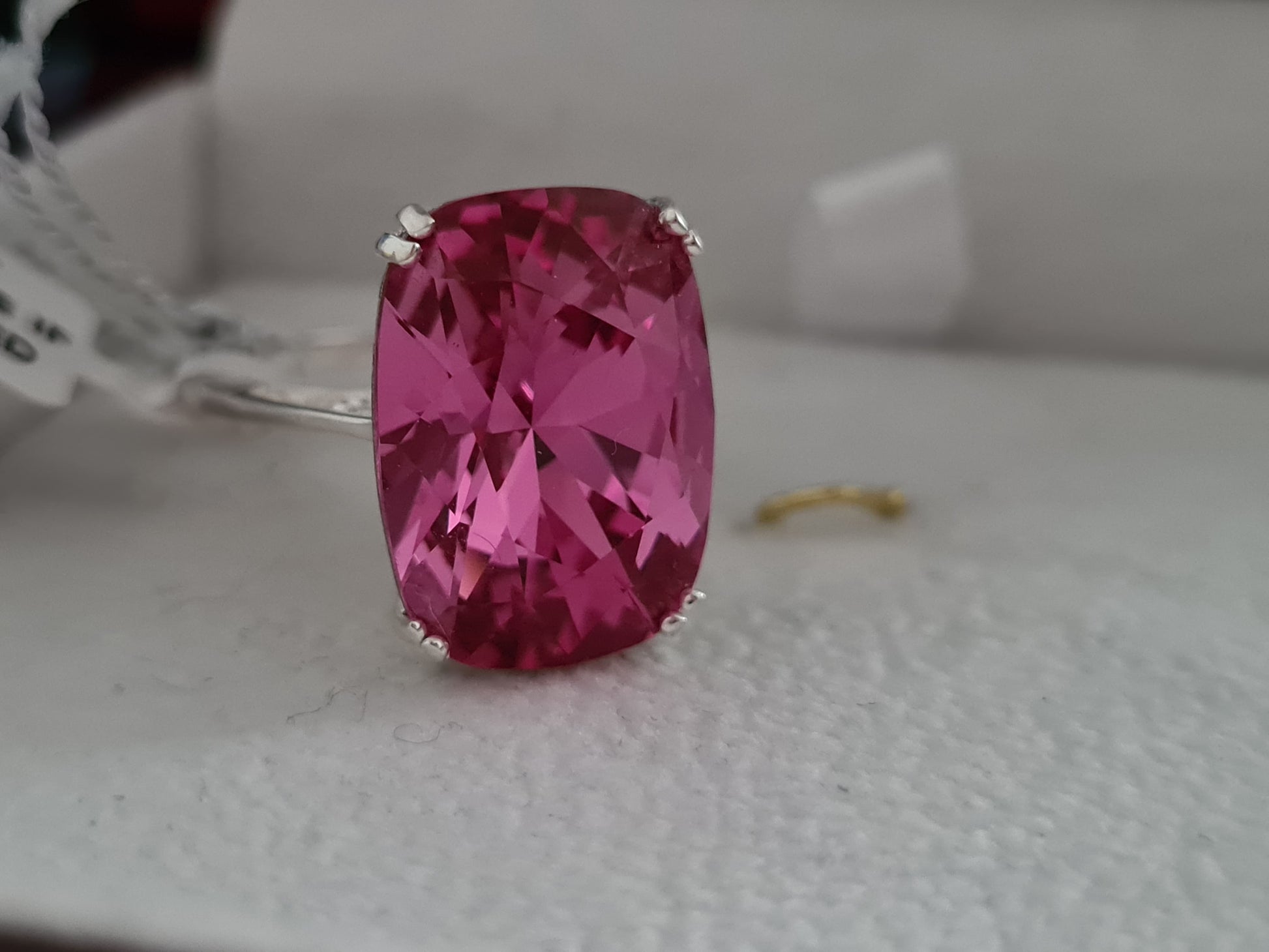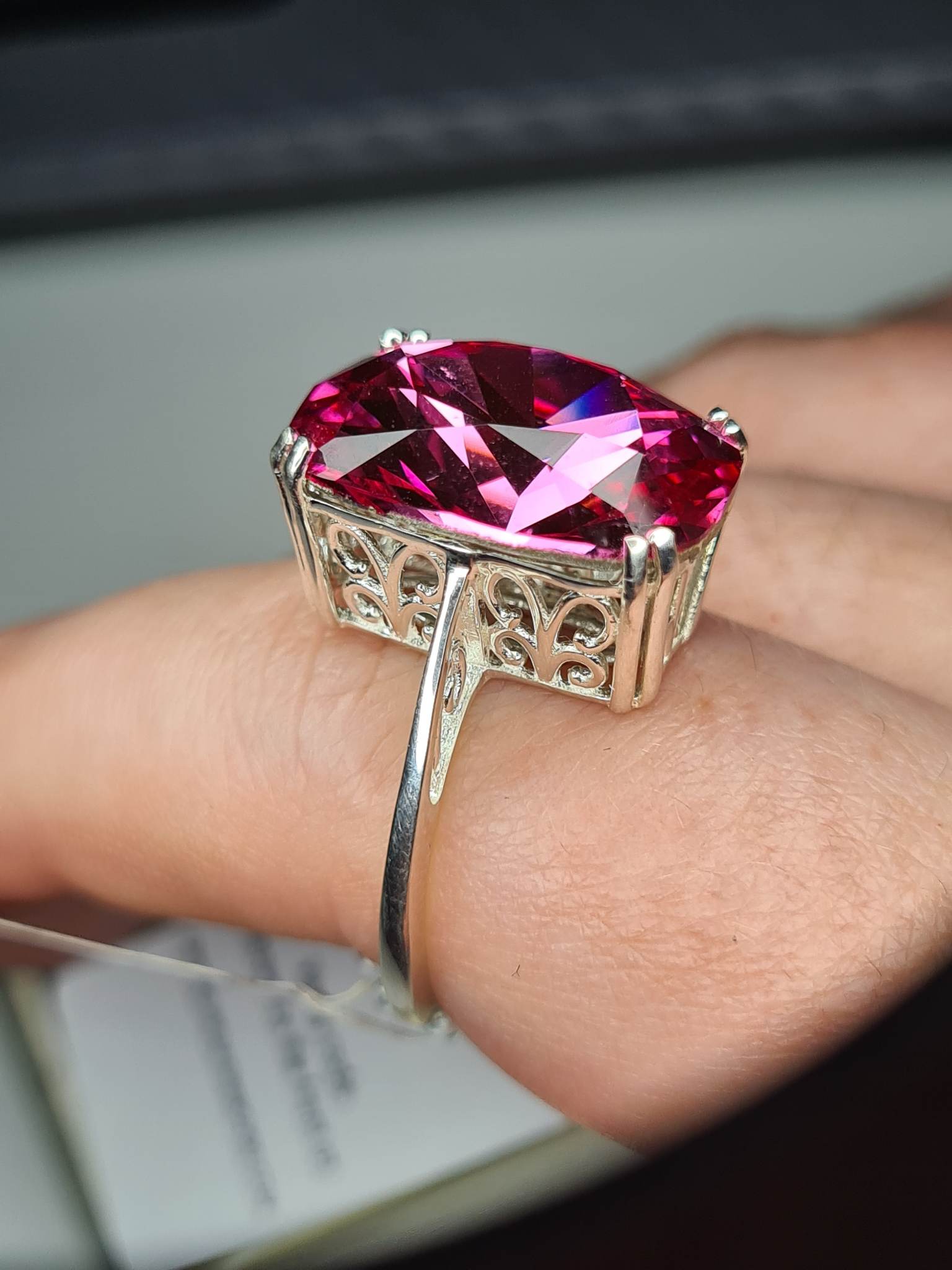 Indulge in the enchanting allure of our Swarovski Pink Rose Crystal Ring, a radiant masterpiece set in hallmarked 925 sterling silver. This captivating ring showcases a breathtaking 18x13mm radiant-cut Swarovski crystal, making it a stunning focal point for a truly unique and limited edition cocktail ring.