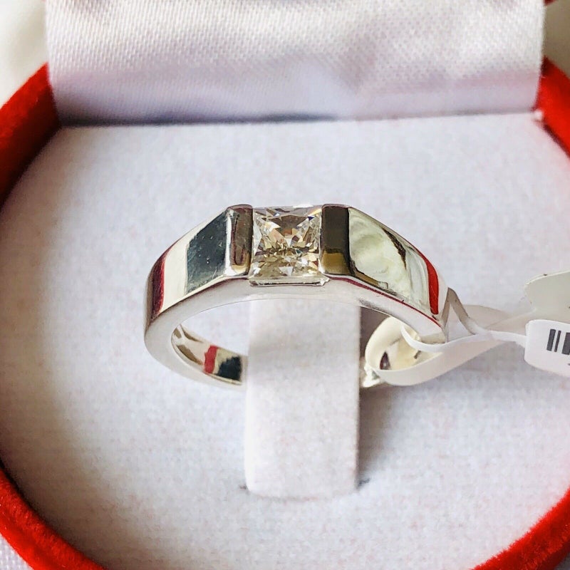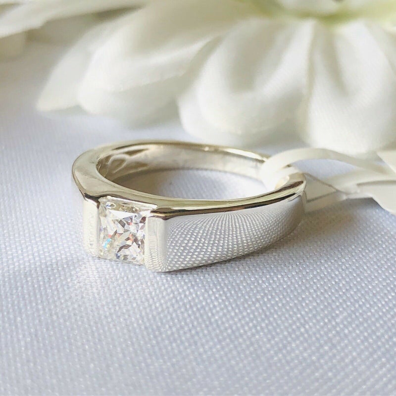 Timeless Sophistication: The small square-cut solitaire, set in a band of sterling silver, adds a touch of timeless sophistication to any outfit.
