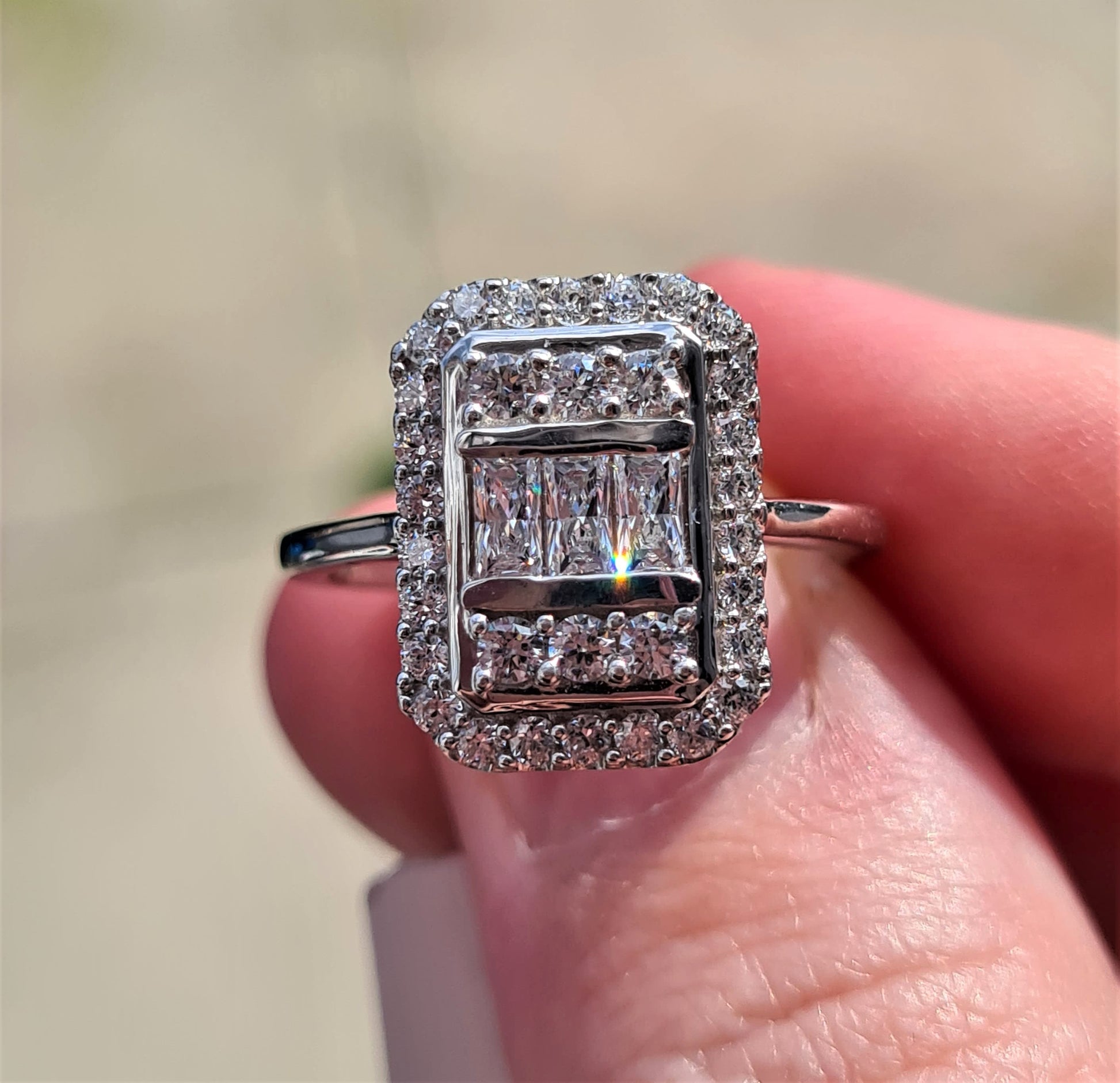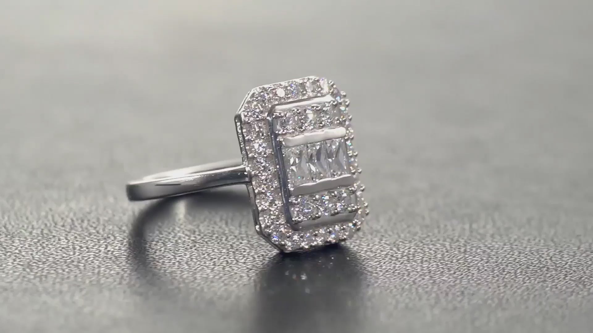 The distinctive design of this ring showcases three baguette-cut Zirconia in the center, flanked by three above and three below, all encased in a halo of small round-cut Zirconias. This unique arrangement adds a touch of sophistication to the cocktail style, creating a statement piece.