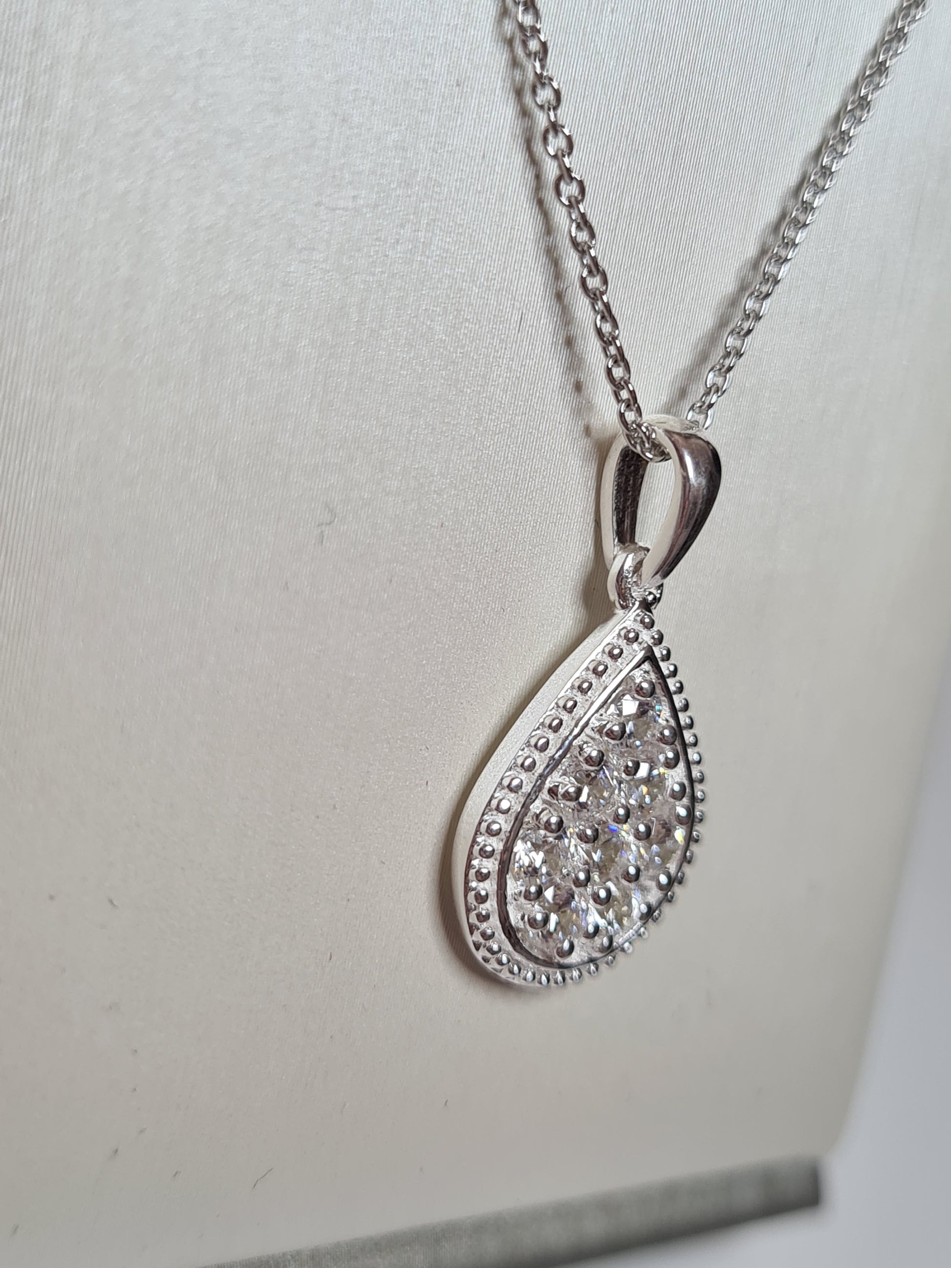 The pendant, a stunning 2.5 cm drop, features a cluster of 8 round cut Swarovski Zirconia, each 0.43 ct. The Pear design, adorned with a Pear-shaped halo of milgrain, creates a timeless and sophisticated aesthetic.