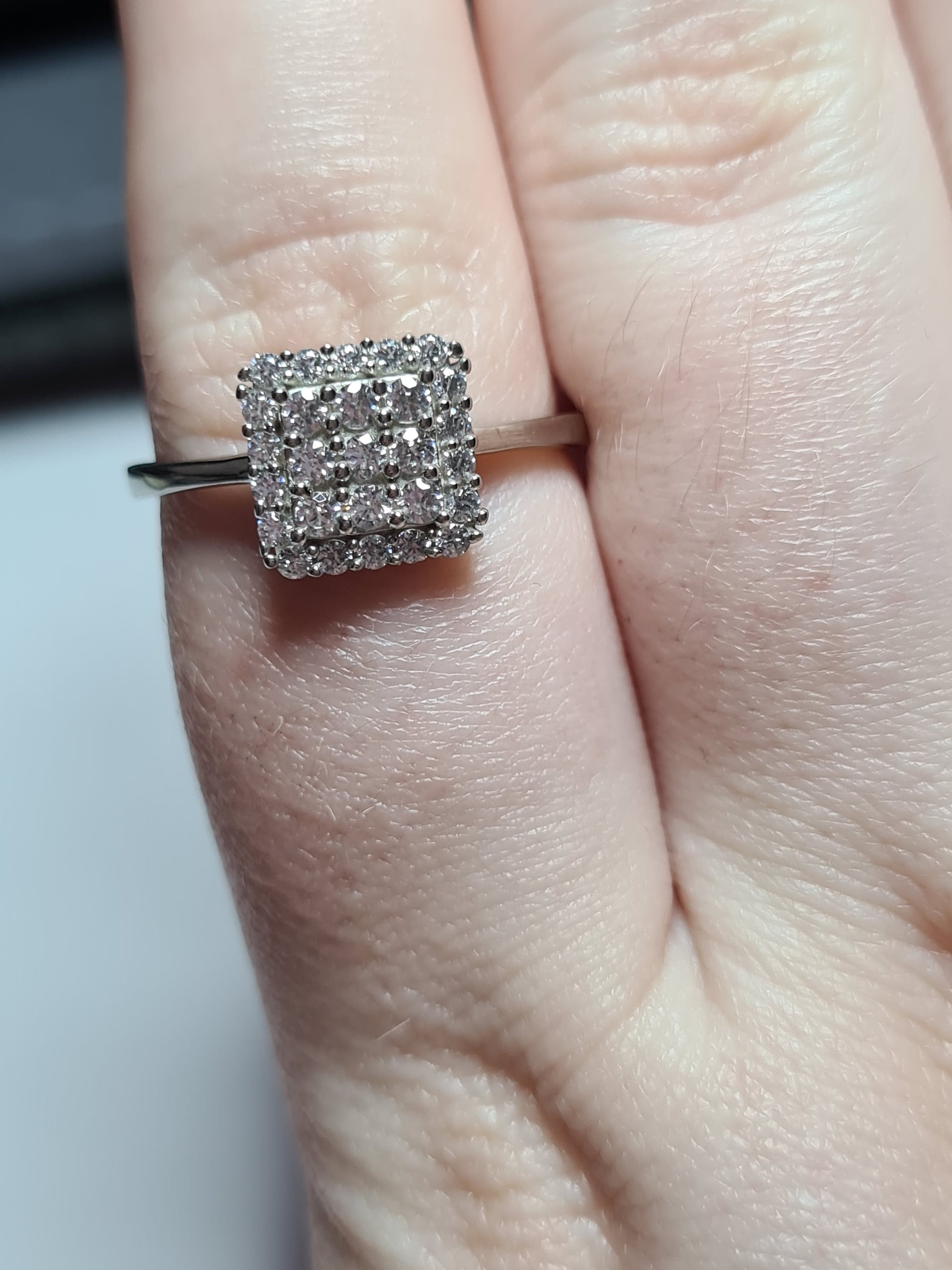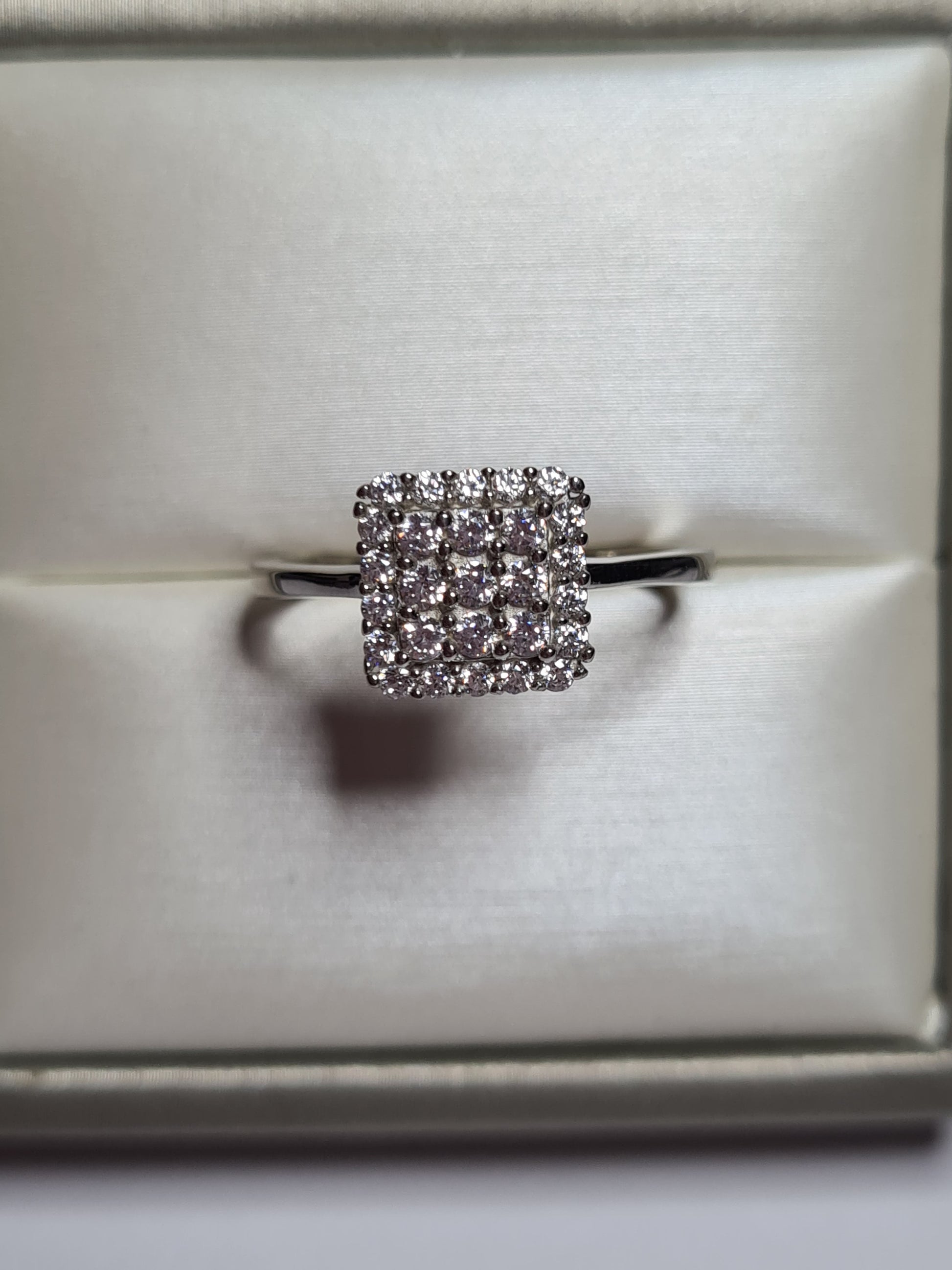 - Stones: 9 Round 2mm Faceted Cut - 0.540ct (creating a center square) and 18 Round 1.5mm Faceted Cut - 0.540ct (forming the outer square).
