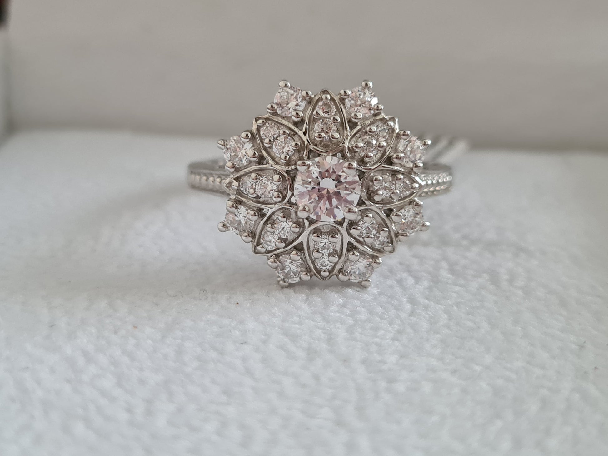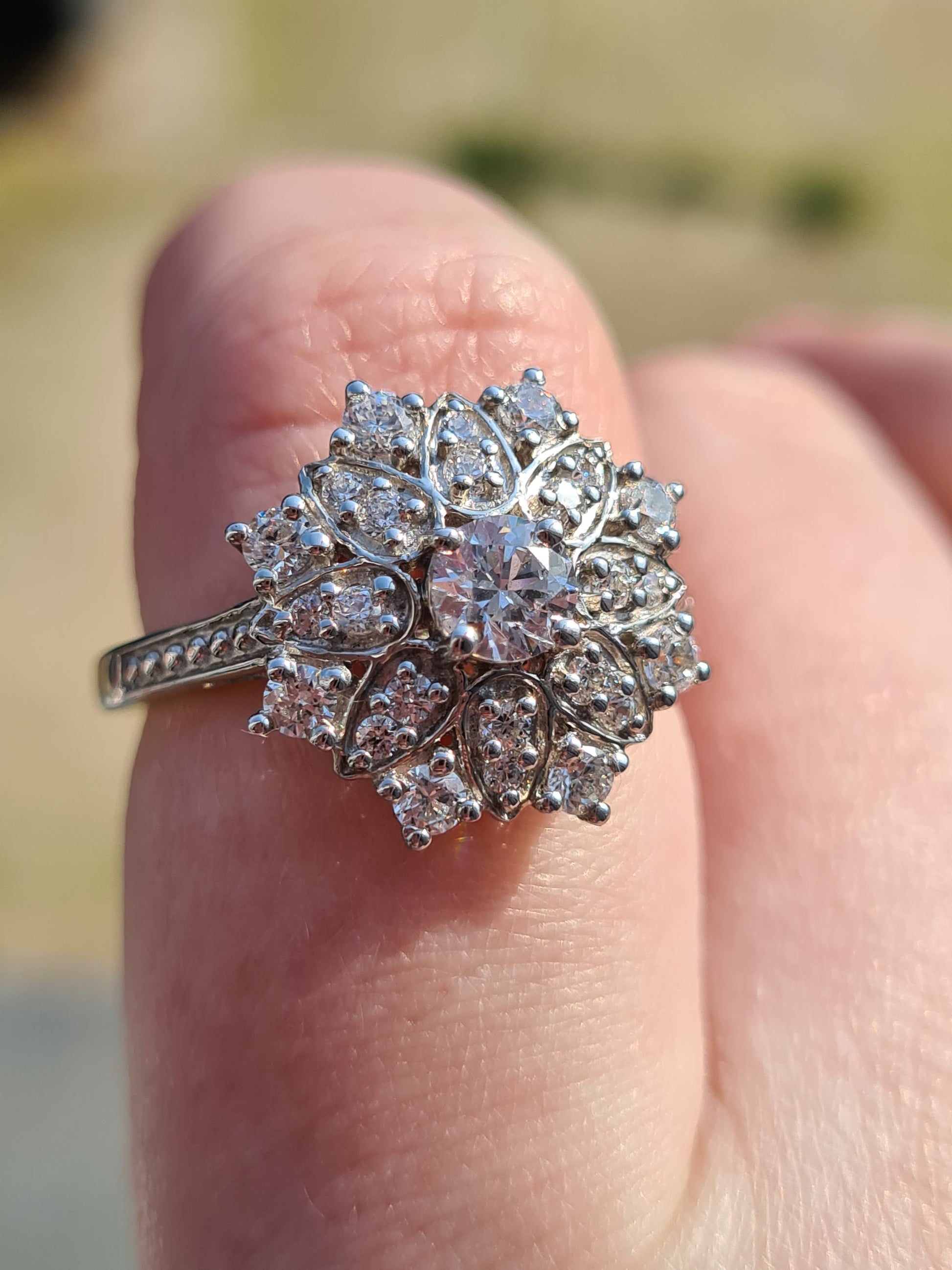 - Style: Cocktail-style ring with a medium-sized center stone and metal detailing forming the petals.