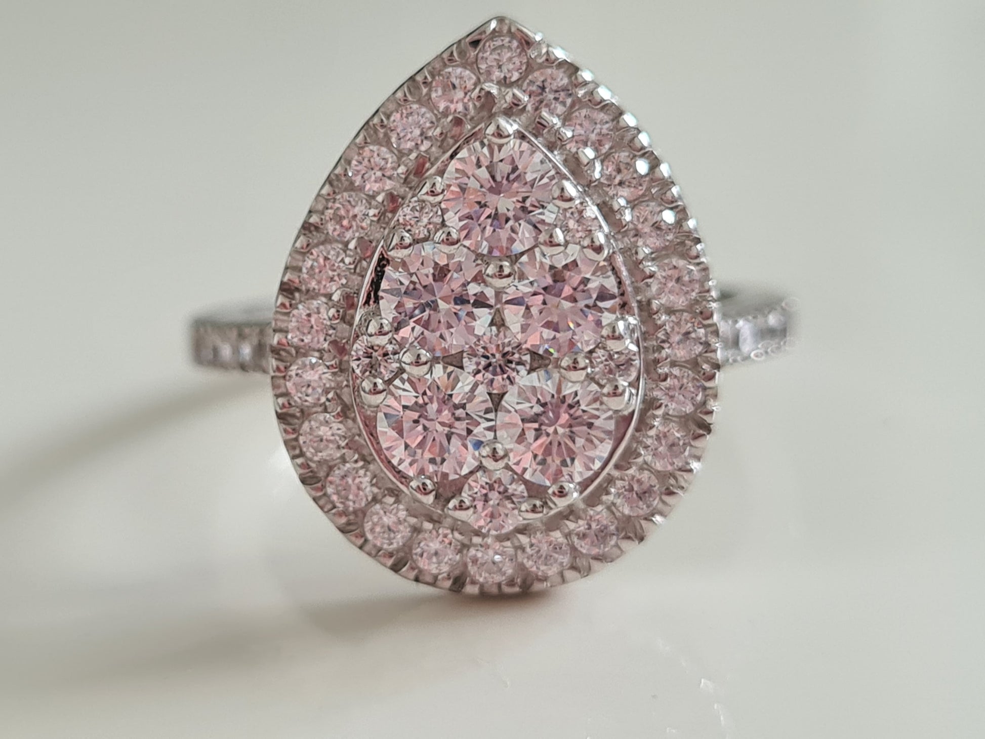 The highlight of this cocktail ring is the pear-shaped cluster formed by round-cut Swarovski, creating a dazzling centerpiece. Surrounding this stunning focal point is a Pear-shaped halo, also composed of smaller round-cut Swarovski, adding an extra layer of brilliance. Further enhancing the design, smaller round-cut Swarovski adorn the shoulders of the ring.
