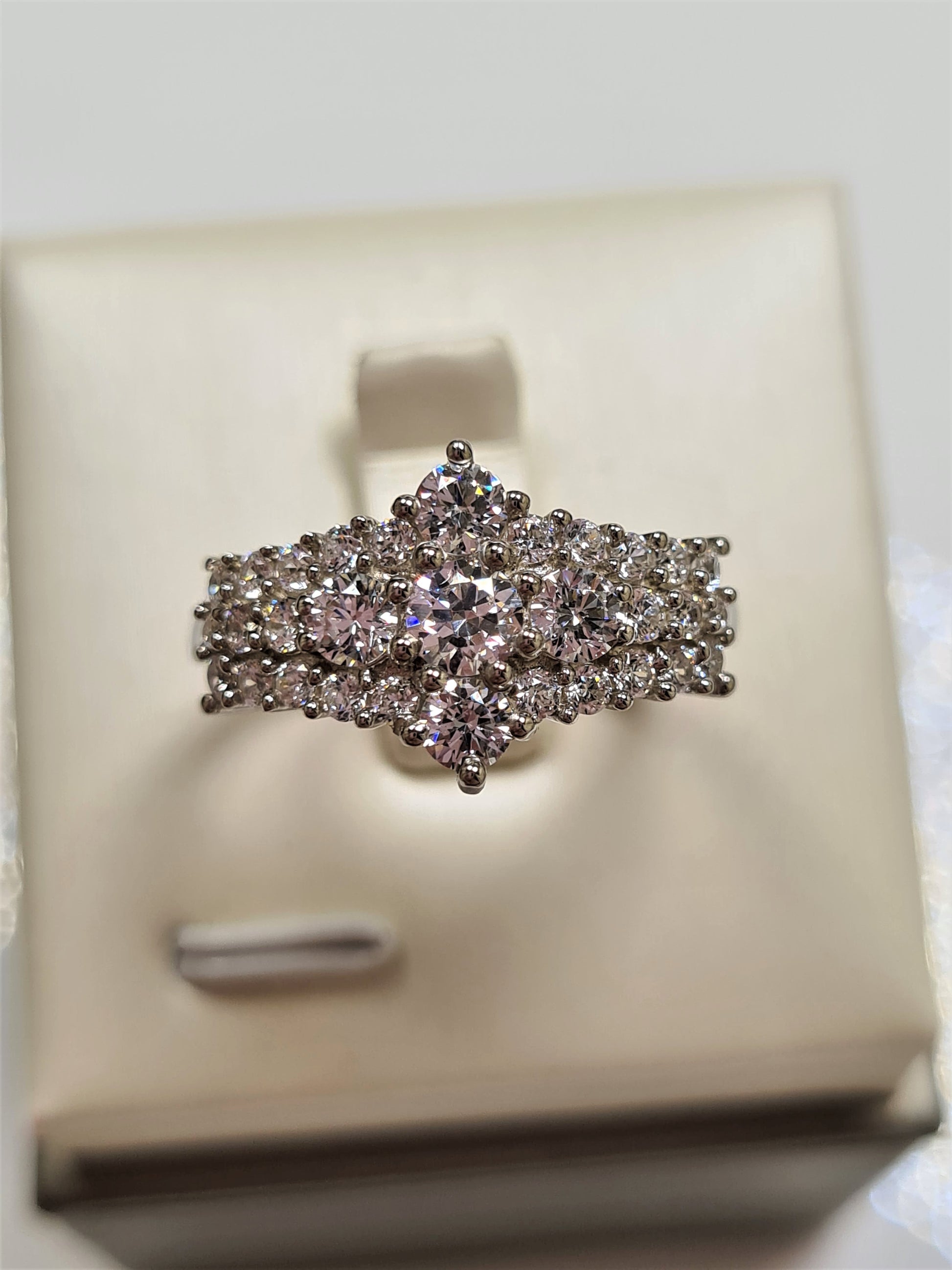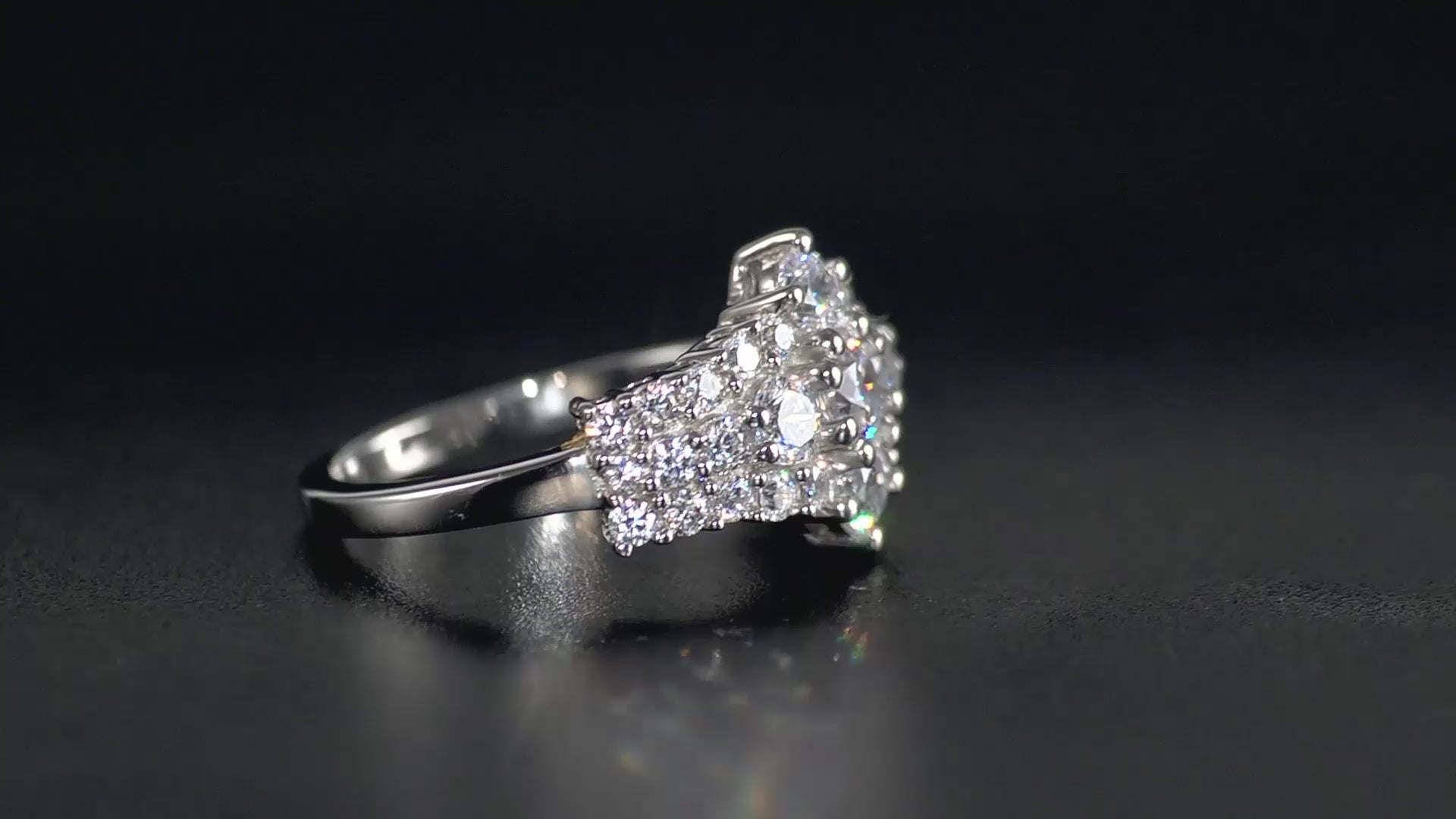 This enchanting cluster ring, reminiscent of a majestic crown, showcases a central round 4mm Swarovski Zirconia with a faceted cut weighing 0.442ct. Each crystal is meticulously secured through prongs on its head, ensuring a dazzling display of brilliance.