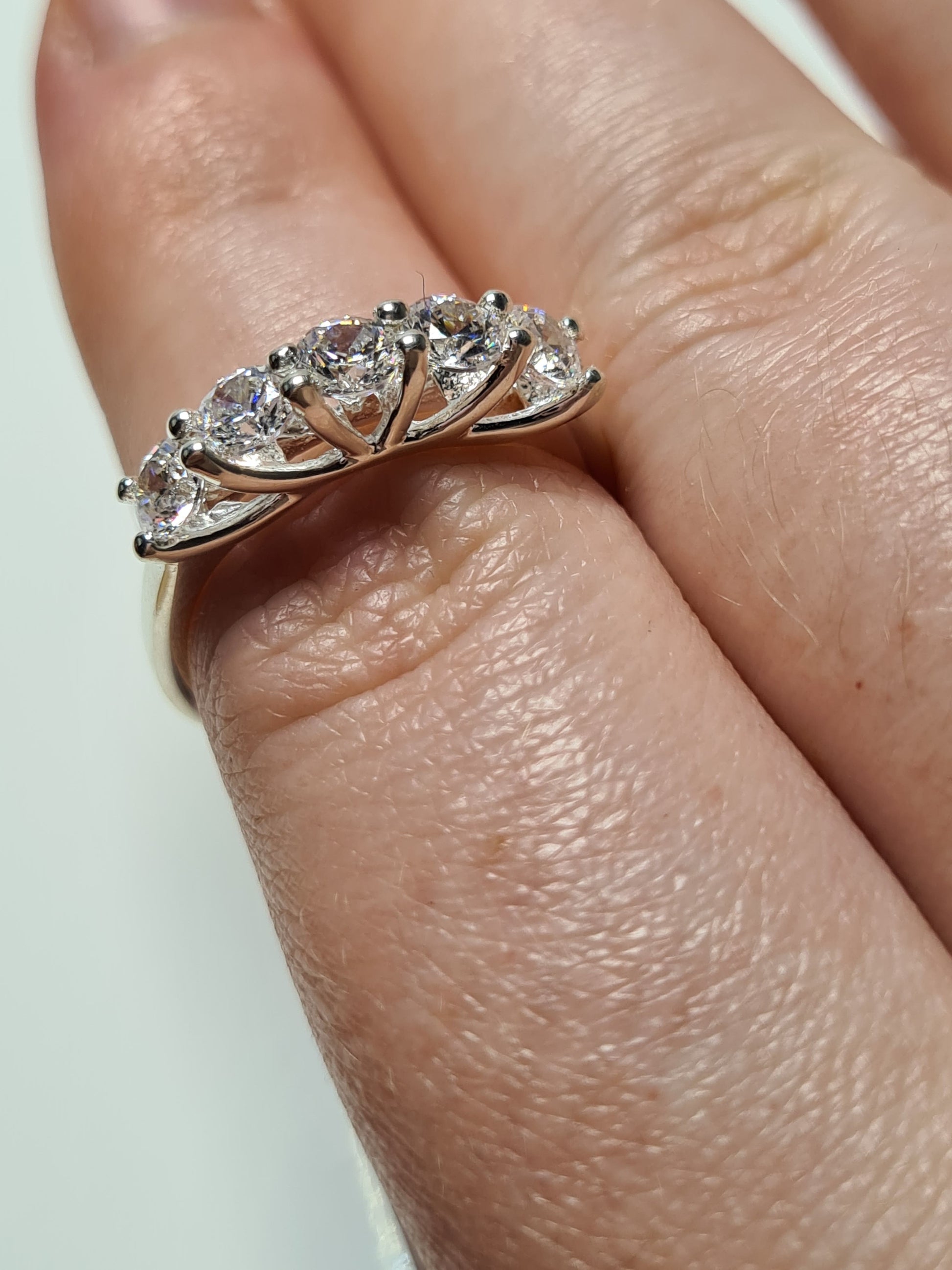 Adorn your finger with the exquisite beauty of our Swarovski Zirconia 5 Stone Ring—a captivating piece set in hallmarked 925 sterling silver. Five round-cut Swarovski Zirconia stones sit elegantly side by side, creating a timeless and radiant allure.