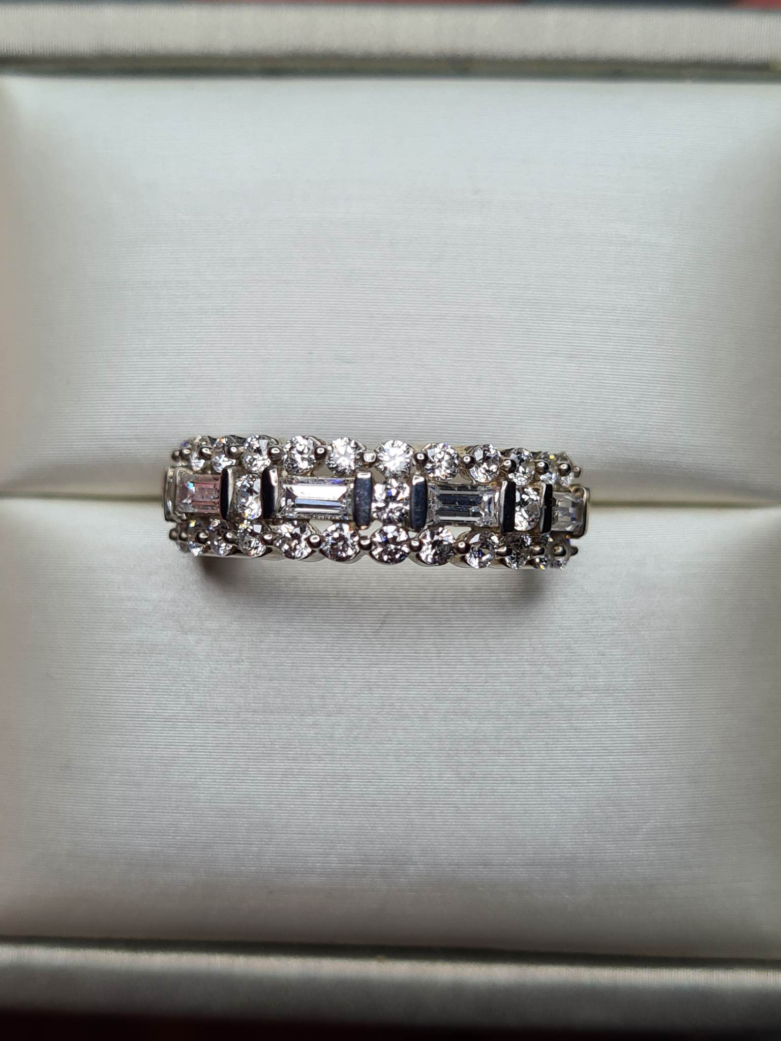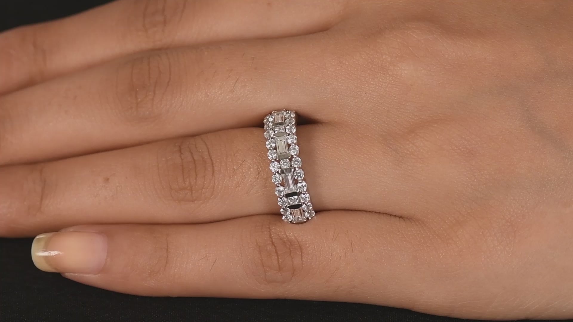 - Design: Unique half eternity design with a combination of round and baguette faceted cut Swarovski Zirconia, creating a masterpiece.