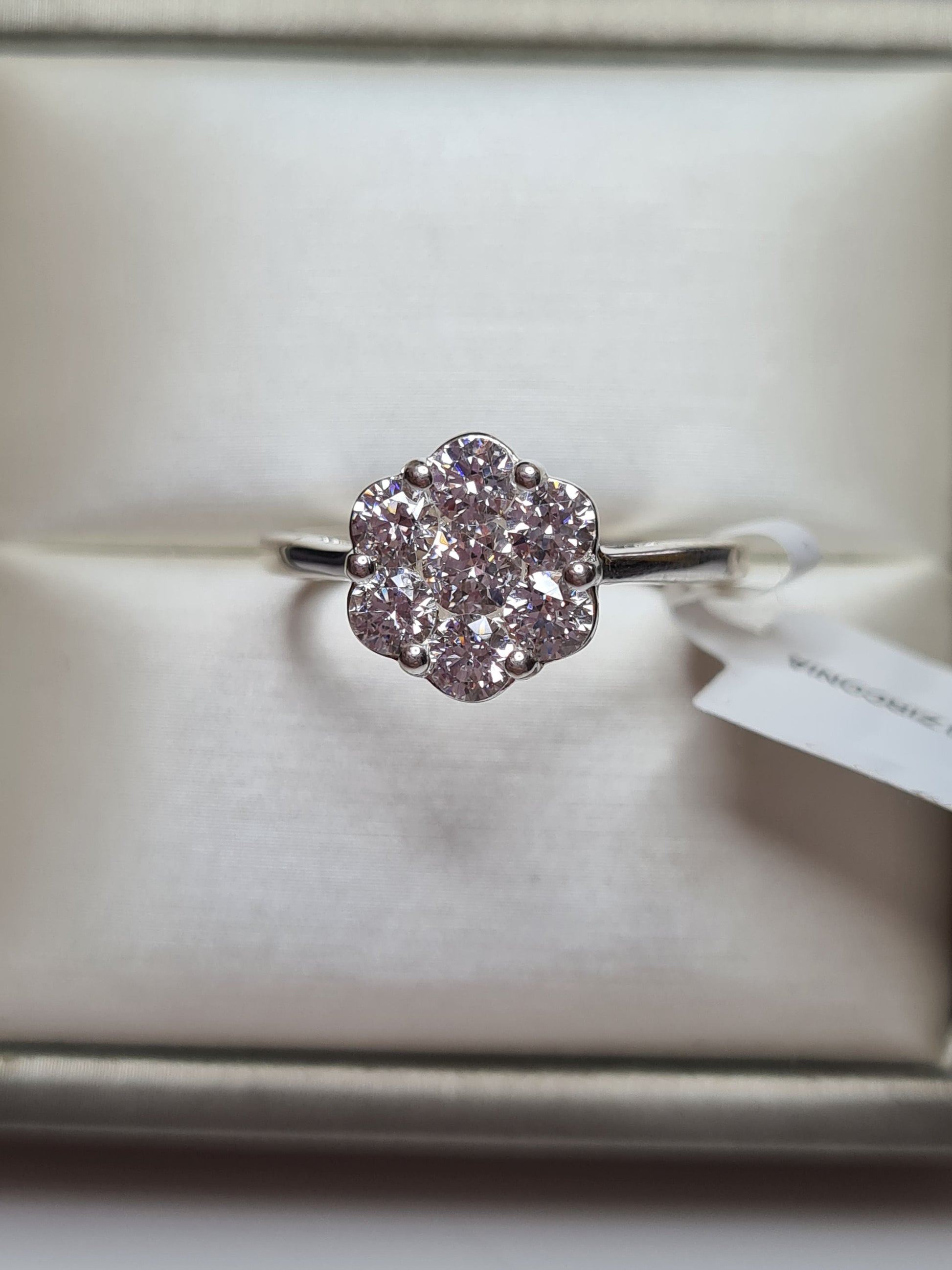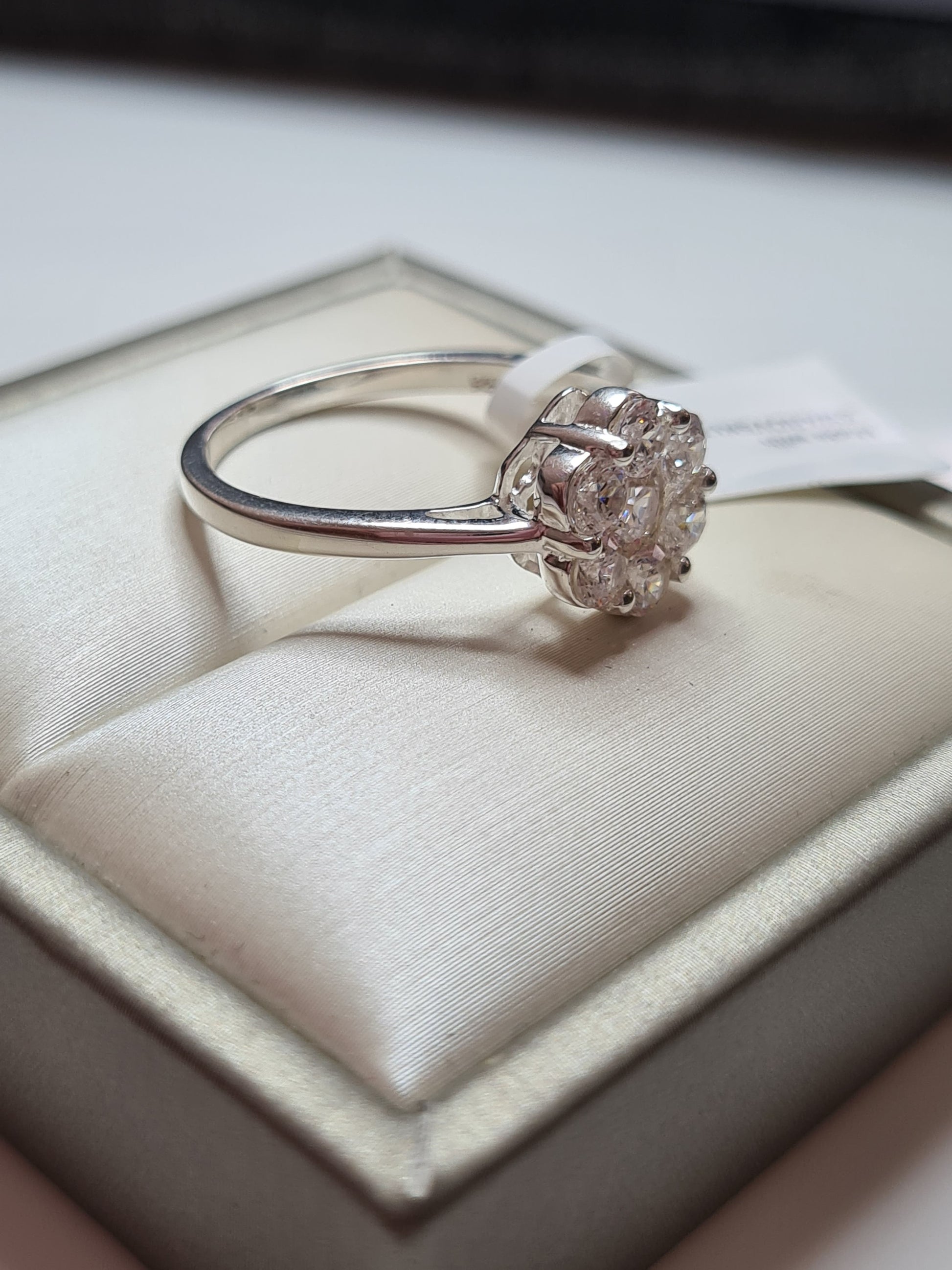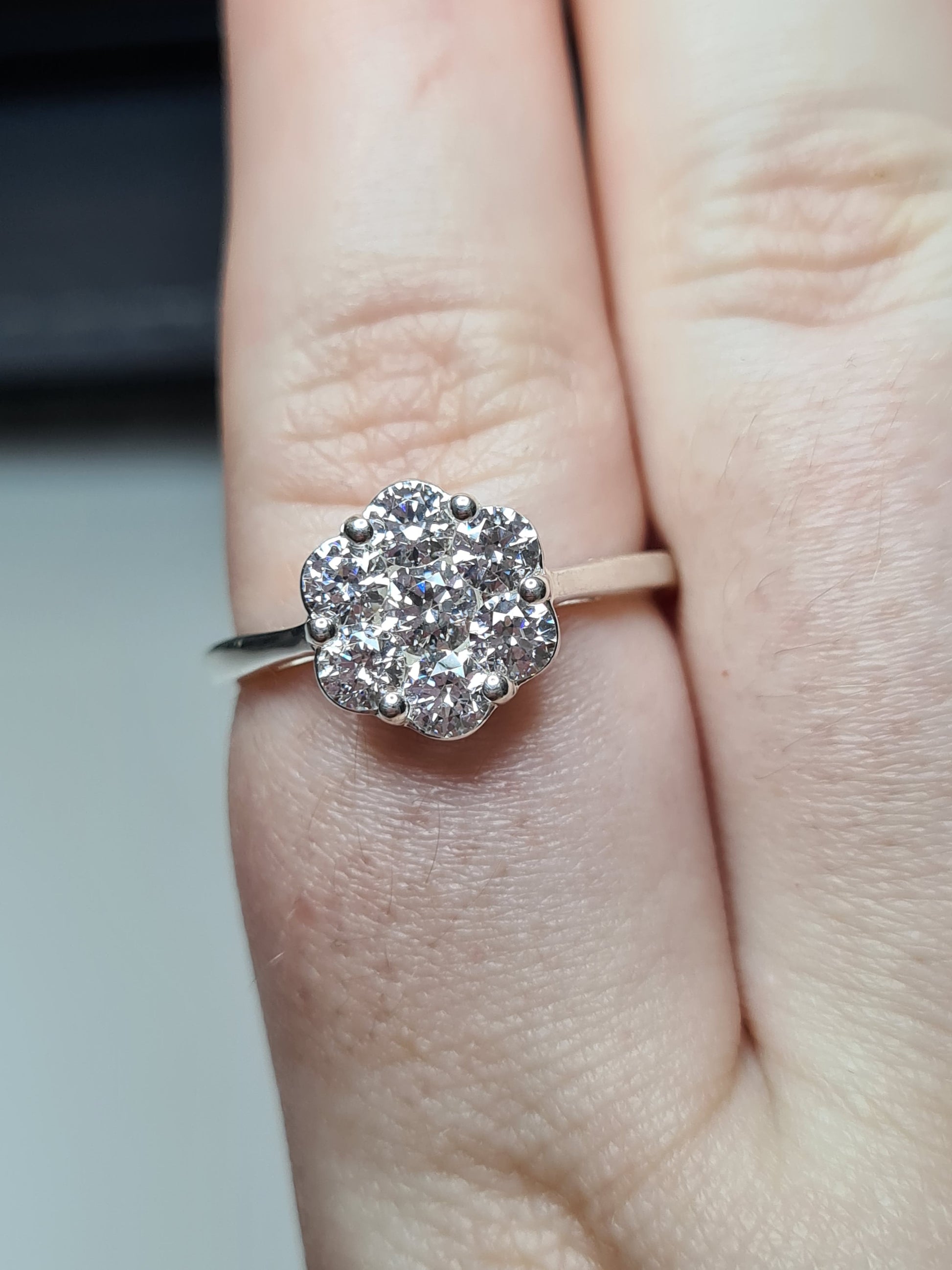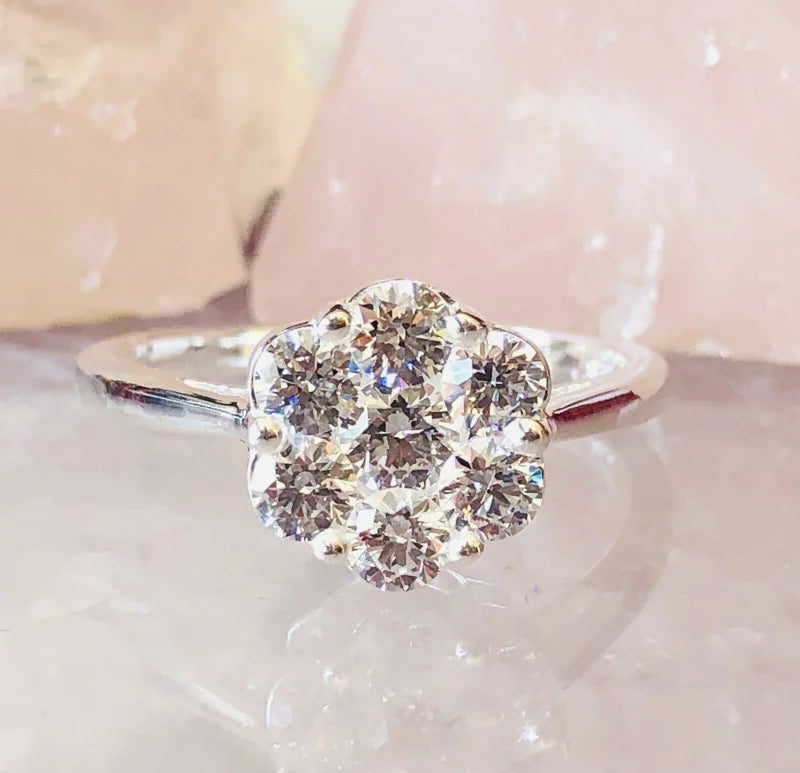 Floral Elegance: This ring draws inspiration from the delicate beauty of flowers, creating an enchanting design that captures the essence of nature. The cluster-style setting showcases 7 sparkling round-cut Swarovski Zirconia.