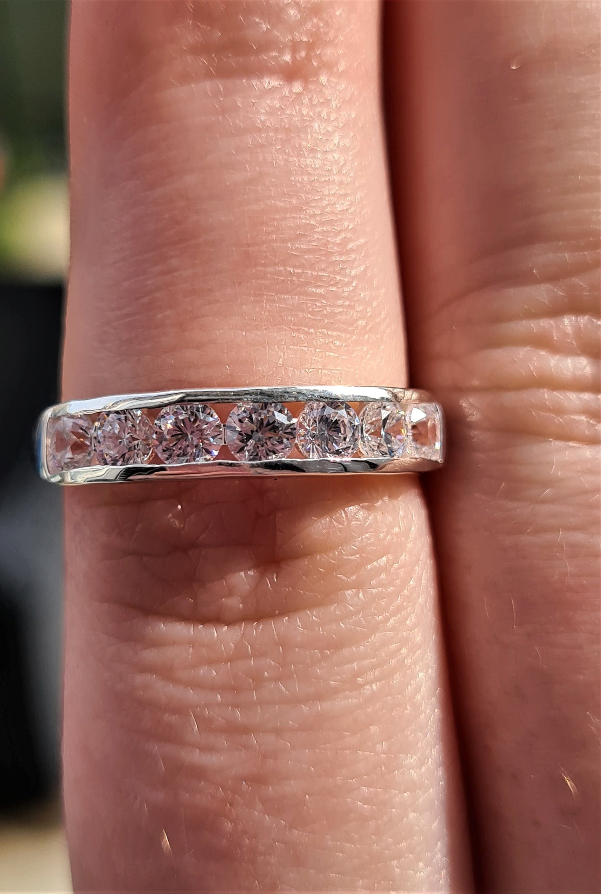 Featuring 7 round-cut Swarovski Zirconia stones, each measuring 3.25mm and featuring a faceted cut, this half eternity ring boasts a total carat weight of 1.743ct. The arrangement of these sparkling stones along the band captures the essence of eternal love and the shared journey a couple embarks upon.
