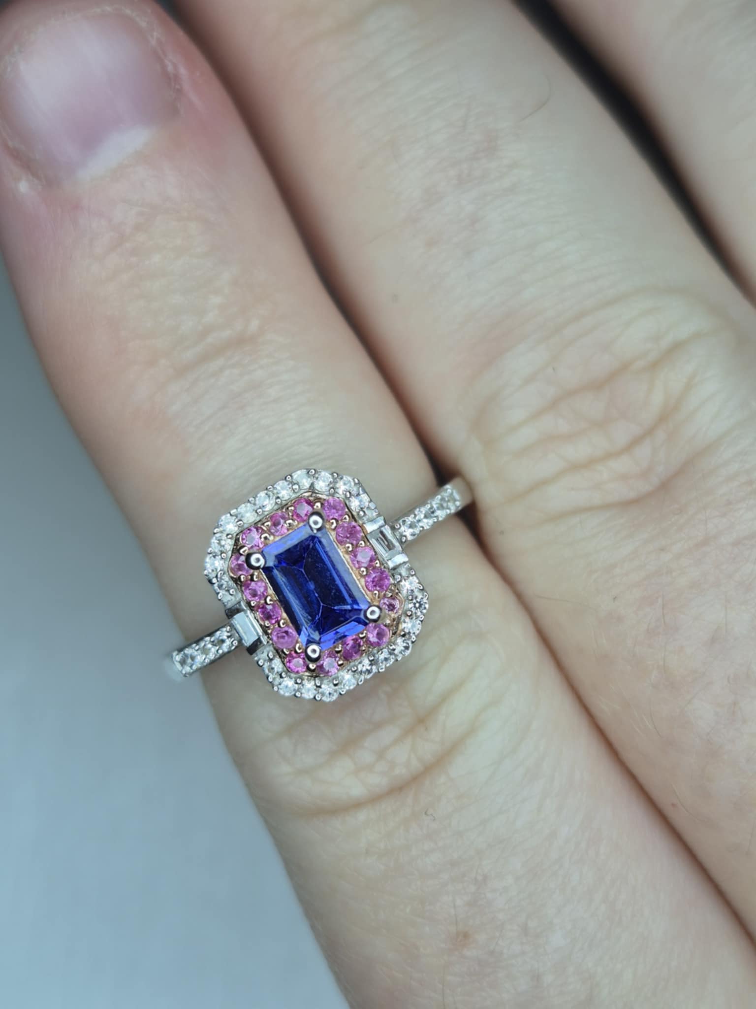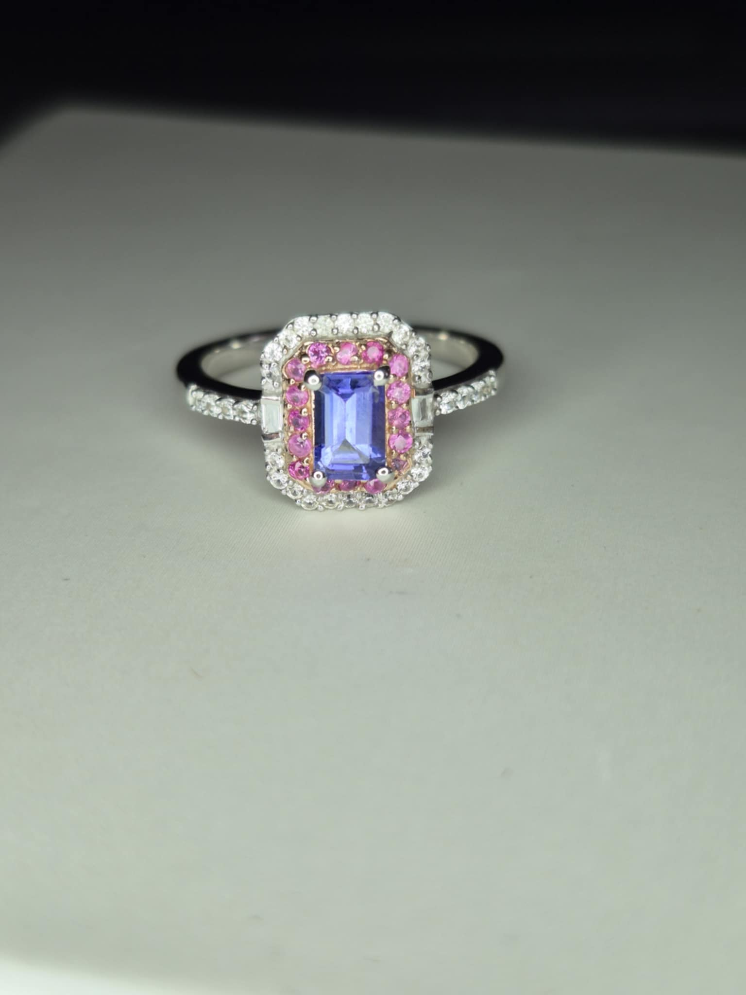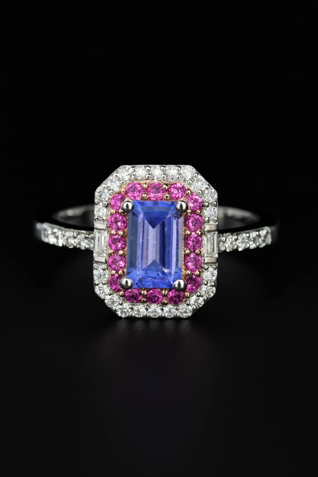 Tanzanite & Pink Sapphire Halo Ring in 18K Rose Gold Overlay 925 Sterling Silver