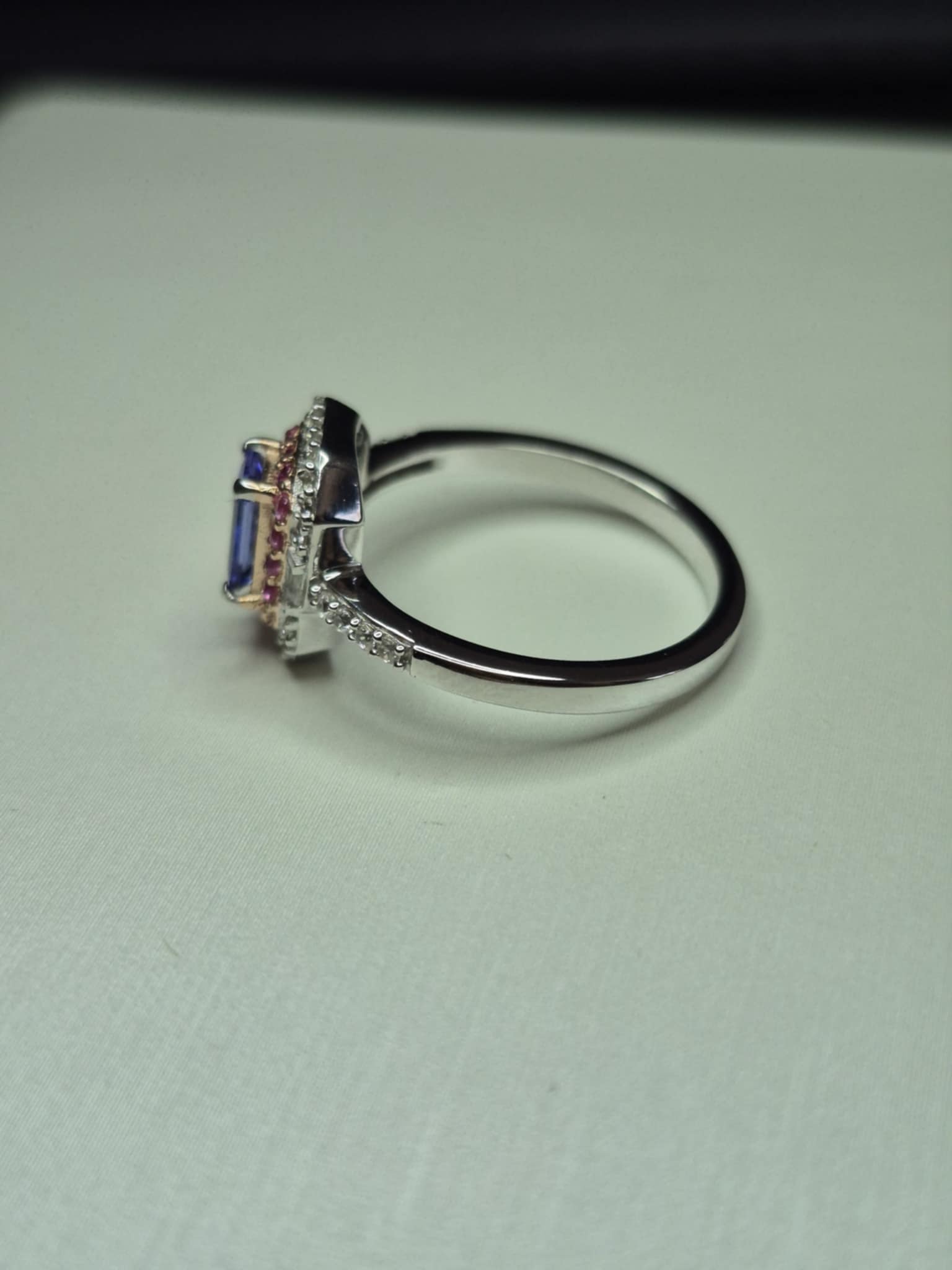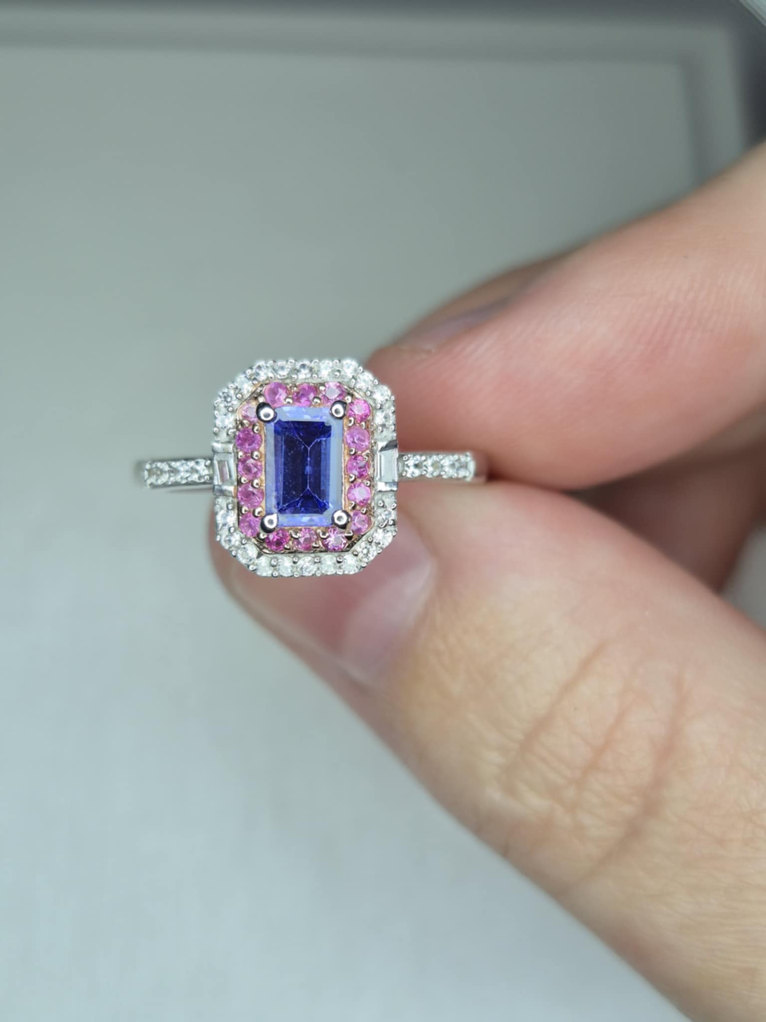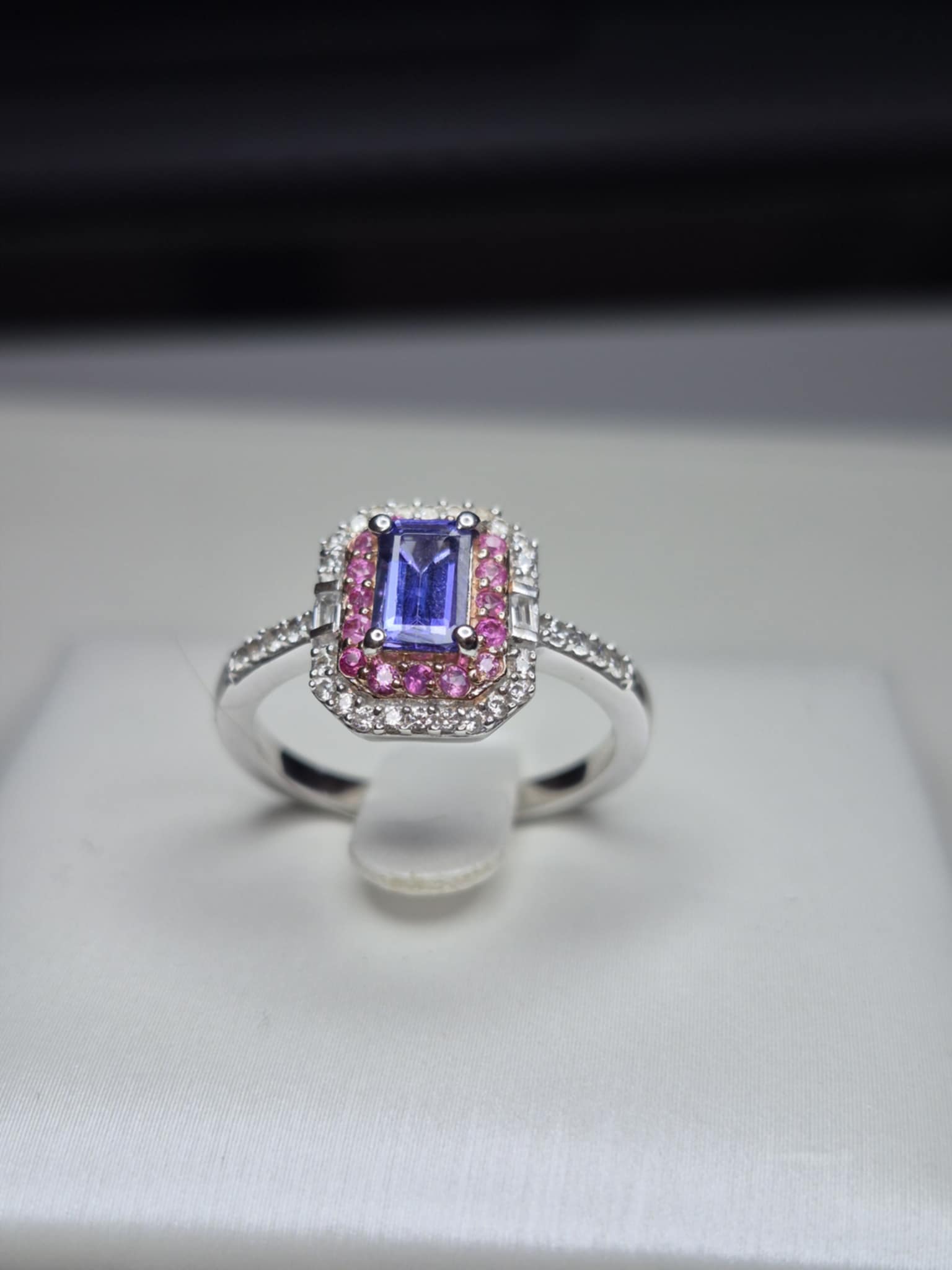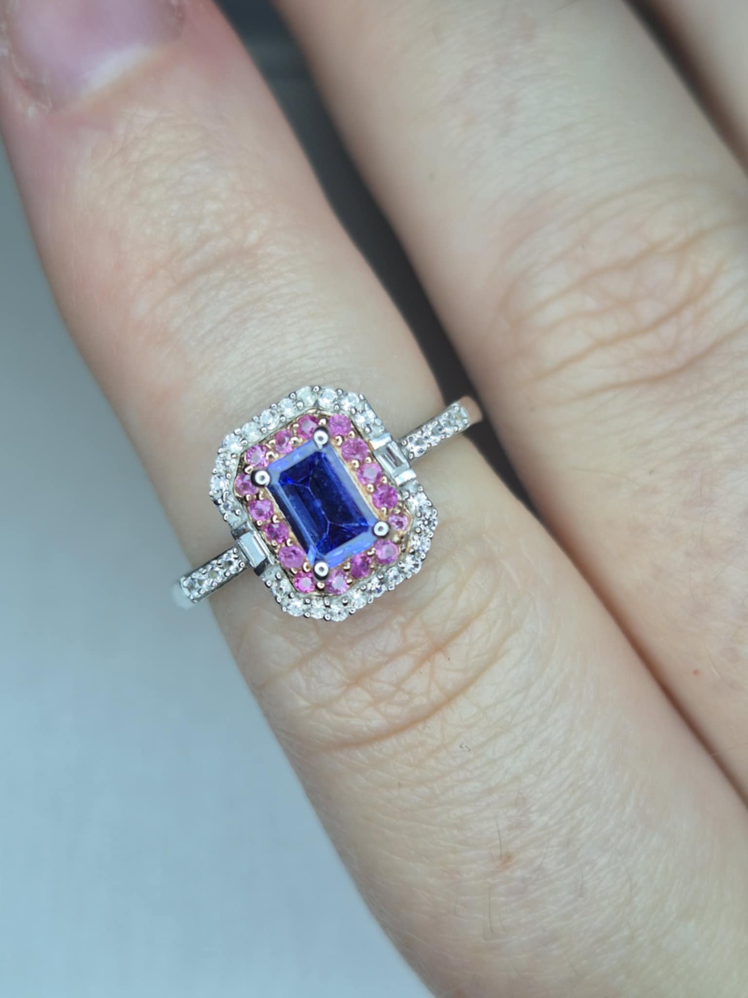 Tanzanite & Pink Sapphire Halo Ring in 18K Rose Gold Overlay 925 Sterling Silver