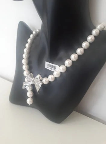 Elegance meets versatility with our White Shell Pearl Necklace, featuring a silver-plated base metal and a unique openable bow lock that allows you to adjust the length effortlessly.