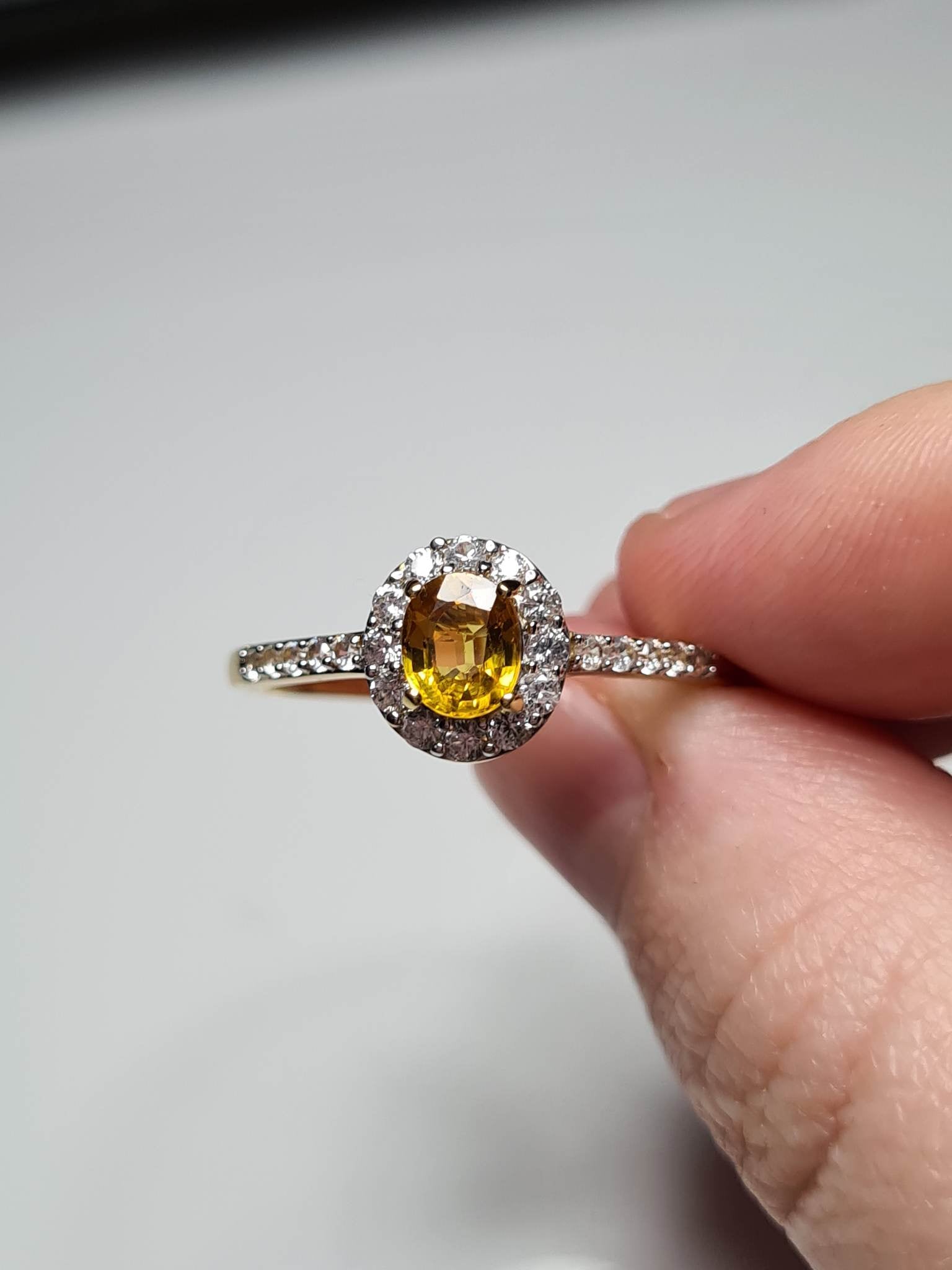 - Gemstones: Yellow Sapphire Oval 6x5mm Faceted Cut, 0.820ct, surrounded by multiple small round cut Zircon forming the halo and adorning the shoulders.